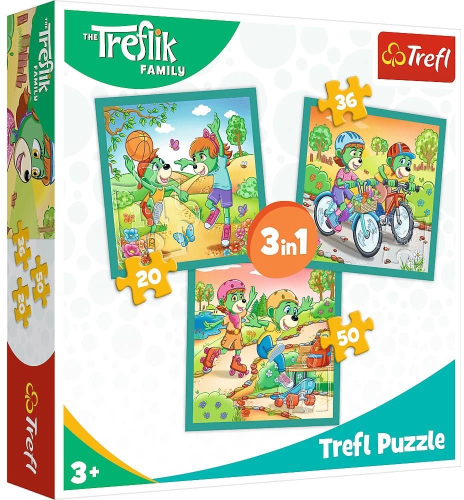 Trefl Puzzle 3w1 Poznaj Trefliki 34872 Poznaj Trefliki to 3 niezależne układanki dla dzieci, zaprojektowane z myślą o małych fanach przygód bohaterów bajki Rodzina Treflików. Po ułożeniu puzzli powstaną obrazki o wymiarach 200x195 mm. Zróżnicowana liczba elementów pozwala na zabawę zarówno młodszym, jak i nieco starszym dzieciom. Puzzle zostały wyprodukowane w Polsce, z wykorzystaniem ekologicznych materiałów. Układanki przeznaczone są dla dzieci powyżej 3. roku życia. Jakość i troska o środowisko Od 1985 roku w Trefl SA poświęcamy się temu, by zapewnić niezapomniane doznania podczas układania puzzli, które są produkowane w 100% w Polsce. Nasze układanki tworzymy z pasją, a każdy element cechuje wysoka jakość wykonania oraz nietoksyczne, przyjazne środowisku materiały.  Po ułożeniu puzzli możesz utrwalić obrazek klejem i powiesić dzieło na ścianie, tworząc piękną dekorację pokoju dziecka. Dlaczego warto układać puzzle? Puzzle to doskonała rozrywka dla każdego, niezależnie od wieku czy umiejętności. Układając, wyrównujemy oddech, tempo bicia serca oraz spada ciśnienie krwi. Kompletowanie puzzli uczy cierpliwości, wspiera koncentrację oraz rozwój kreatywności. Rozpocznij przygodę z nową pasją już dziś! Szukasz pomysłu na miły wieczór w domowym zaciszu? Układanie puzzli to świetny sposób na spędzenie wolnego czasu w gronie przyjaciół i rodziny a do tego rewelacyjny trening dla mózgu. Szeroki wybór wzorów pozwala wybrać układankę dopasowaną do Twoich zainteresowań. Puzzle są doskonałym prezentem z okazji urodzin lub świąt. Odkryj Niezbędnik Puzzlomaniaka!