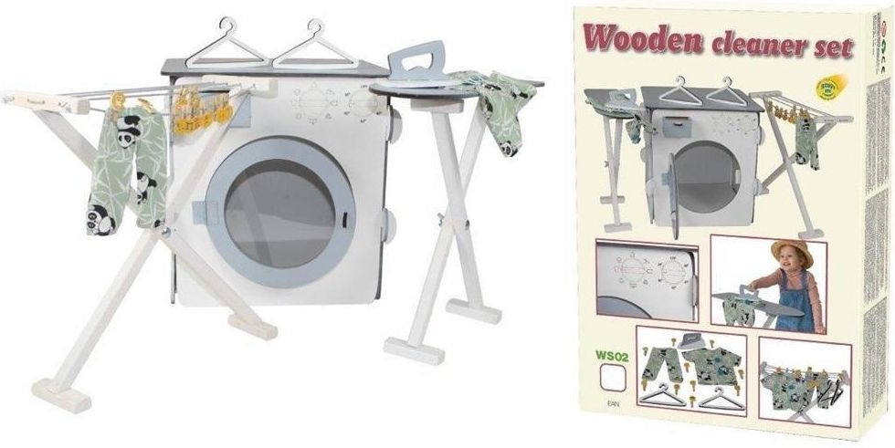 DUŻY, Drewniany, kolorowy zestaw pralka, suszarka, deska do prasowania! Zestaw zawiera: pralkę, suszarkę, deskę do prasowania, dwa wieszaki, koszulę i spodnie, 10 klamerek-emotikonek oraz żelazko. Całość znajduje się w kolorowym opakowaniu. Wymiary suszarka na pranie 38x15x38 deska do prasowania 14,5x44x40 pralka 33,5x41x40,5 EAN: 5905325439663