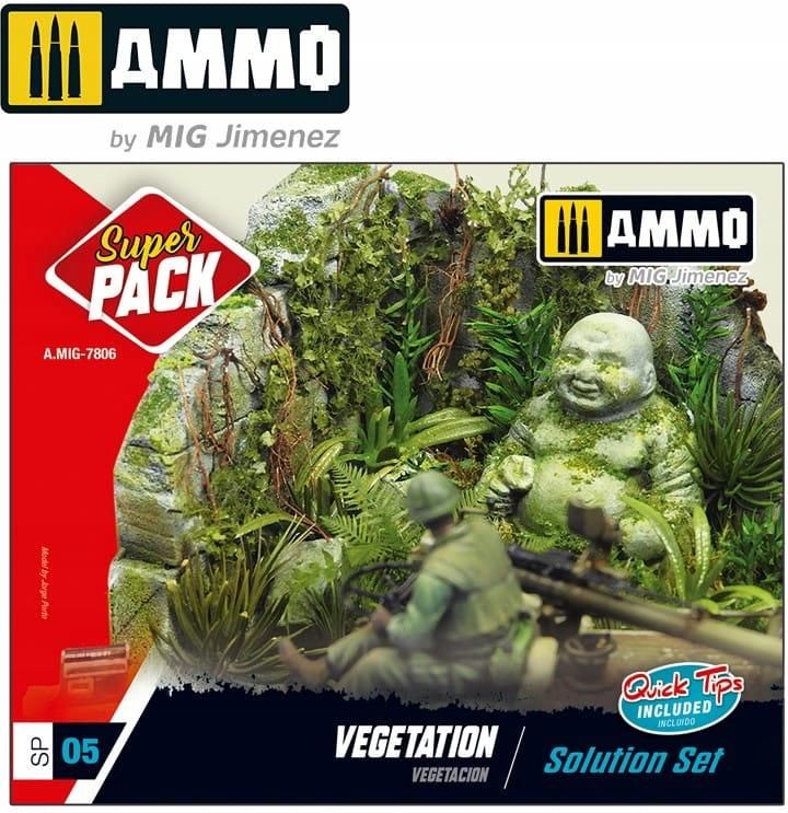 AMMO MIG 7806 - Vegetation Solution Set - Super Pack Zestaw chemii modelarskiej, zawiera kolory i produkty potrzebne do malowania różnych obszarów podłoża imitującego roślinność, dodatkiem są dwa zestawy wycinanej laserowo roślinności. Zawartość zestawu: farby akrylowe: A.MIG-0007 RAL 7017 …