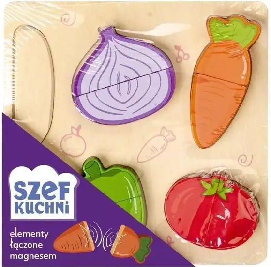 Zabawkowy zestaw dla małego mistrza kuchni Prezentując zestaw "Szef kuchni", odkryjemy przed dzieckiem fascynujący świat kulinariów, który pobudzi jego wyobraźnię, kreatywność oraz motorykę. Dzięki tej zabawce Twoja pociecha ma okazję poznać wiele owoców, warzyw i smakowitych przekąsek, a także opanować podstawy gotowania i zrozumieć, jak ważne jest zdrowe odżywianie. W skład zestawu, którego wszystkie elementy zostały minimalistycznie wykonane z drewna, wchodzą m.in. warzywa i owoce przywrócone do życia w wyjątkowo estetycznej formie. Drewniane elementy są pokryte bezpieczną dla dzieci farbą, dzięki czemu nie można się obawiać o zdrowie twojego dziecka. Dodatkowo, każdy z elementów posiada magnes, co umożliwia "krojenie" warzyw i owoców w bardzo realistyczny sposób. Zestaw "Szef kuchni" to idealna propozycja dla wszystkich rodziców, którzy pragną wspólnie z dzieckiem odkrywać tajemnice sztuki kulinarnej oraz uczyć pociechę, jak dbać o zdrowie poprzez odpowiednią dietę. EAN: 5905422041288