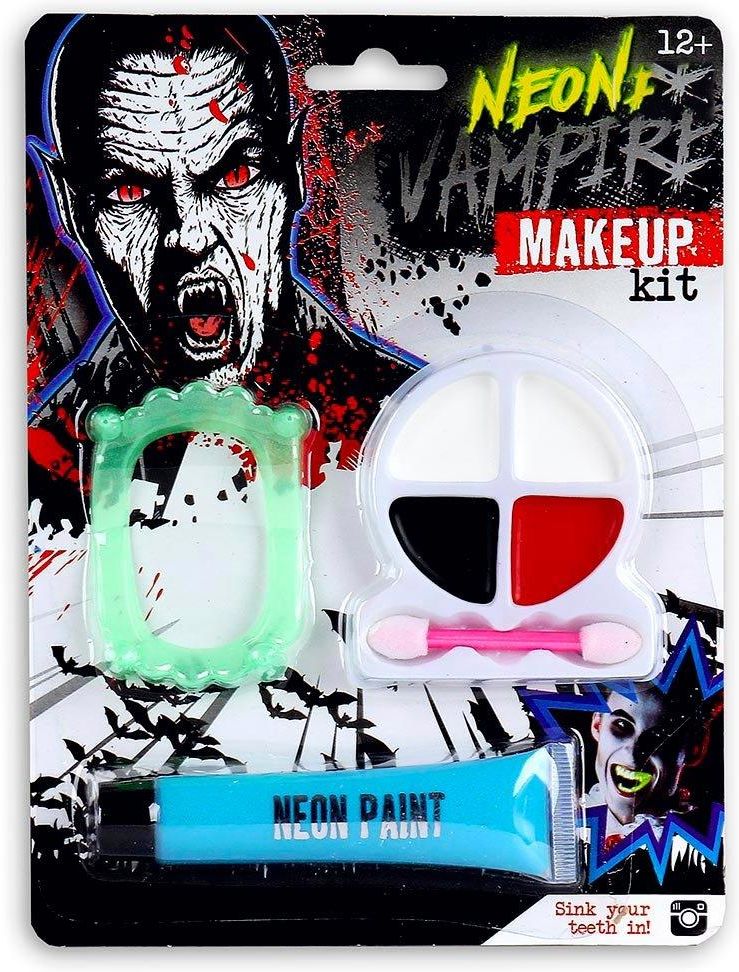 - zestaw do makijażu, Wampir - zawiera: cztery farby do twarzy, tubkę neonowej farby, sztuczne zęby, aplikator - pakowane na blistrze