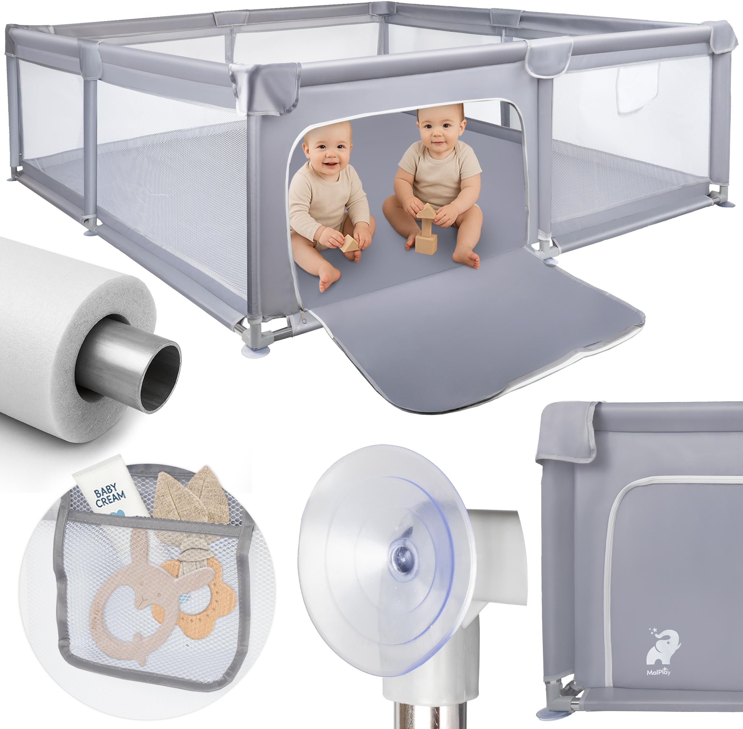 KOJEC DLA DZIECKA SKŁADANY SUCHY BASEN PLAC ZABAW DZIECIĘCY 180X200 CM SZARY Najważniejsze cechy produktu Nowoczesny i bezpieczny design – elegancki, neutralny szary kolor pasujący do każdego wnętrza 4 przewiewne ścianki z siatki – doskonała widoczność i stała wentylacja z każdej strony Wejście na zamek błyskawiczny - obsługiwane z zewnątrz zapobiega samodzielnemu wychodzeniu dziecka bez wiedzy rodzica 4 antypoślizgowe przyssawki w zestawie – zapewniają lepszą stabilność kojca na gładkich powierzchniach Szybki montaż bez narzędzi – składanie i rozkładanie zajmuje kilka minut Maksymalne obciążenie: do 15 kg Duża powierzchnia do zabawy – aż 180 × 200 cm przestrzeni dla dziecka Piankowe osłony górnych i bocznych rurek – chronią główkę dziecka przed uderzeniami Materiałowe nakładki na łączniki – bezpieczne i estetyczne wykończenie konstrukcji Siateczkowa kieszonka – praktyczne miejsce na zabawkę, butelkę lub pieluszkę Łatwe czyszczenie – tkaniny można przecierać wilgotną ściereczką lub prać ręcznie po zdjęciu stelaża Odporność na codzienne użytkowanie – trwała konstrukcja stalowa Spełnia normę bezpieczeństwa EN 12227:2010 Specyfikacja techniczna Model: KIVO Wymiary zewnętrzne kojca: 183 × 204 cm Wymiary wewnętrzne (powierzchnia użytkowa): 180 × 200 cm Wysokość całkowita: 61 cm Wymiary wejścia: 45 x 70 cm Średnica rurki stalowej: 2,2 cm Średnica rurki z otuliną piankową: 4 cm Długość rurki poziomej I: 97 cm Długość rurki poziomej II: 87cm Długość rurki pionowej: 55 cm Materiał: 100% poliester (pokrycie), stal (rurki), PP (łączniki) Maksymalne obciążenie: 15 kg Wiek dziecka: 6–36 miesięcy Normy bezpieczeństwa: EN 12227:2010 Montaż: beznarzędziowy Siateczkowe ścianki: z 4 stron Elementy ochronne: piankowe osłony na górnych rurkach, zaokrąglone narożniki Czyszczenie: wilgotna ściereczka lub ręczne pranie tekstyliów po zdjęciu Waga produktu:4 kg Wymiary opakowania: 24 x 16,5 x 98,5 cm Łatwy montaż – gotowe w kilka minut System składania kojca KIVO opiera się na prostym mechanizmie bez użycia narzędzi. Wystarczy połączyć elementy stelaża i naciągnąć materiałową powłokę – wszystko zgodnie z dołączoną instrukcją obrazkową. Dzięki przyssawkom kojec zyskuje stabilność, a montaż i demontaż nie wymaga siły ani specjalnych narzędzi. Idealny wybór do codziennego użytkowania w domu, bez konieczności składania go każdego dnia! Funkcjonalność i bezpieczeństwo KIVO 180x200 cm to bezpieczne i funkcjonalne rozwiązanie stworzone z myślą o dzieciach od 6 do 36 miesięcy. Dzięki solidnej stalowej konstrukcji oraz przyssawkom w narożnikach, kojec pozostaje stabilny nawet przy intensywnej zabawie. Przewiewne, siateczkowe ścianki - zapewniają doskonałą widoczność i cyrkulację powietrza, Piankowe osłony na górnych i bocznych rurkach - chronią dziecko przed przypadkowymi uderzeniami, Materiałowe nakładki na plastikowe łączniki - zwiększają komfort i bezpieczeństwo, Zamek błyskawiczny obsługiwany z zewnątrz - umożliwia szybki dostęp do wnętrza kojca dla opiekuna, jednocześnie zapobiegając samodzielnemu wychodzeniu dziecka w nieodpowiednim momencie. Idealny do zabawy i nauki samodzielności Nasz kojec to przestronna i bezpieczna strefa dla Twojego dziecka – idealna do zabawy, nauki raczkowania, pierwszych prób wstawania i samodzielnej eksploracji. Dzięki wejściu na zamek błyskawiczny, obsługiwanemu wyłącznie z zewnątrz, rodzic może w pełnikontrolować dostęp do wnętrza kojca. Starsze dzieci mogą samodzielnie wchodzić i wychodzić za zgodą opiekuna, co wspiera rozwój samodzielności i buduje poczucie bezpieczeństwa. Duża powierzchnia użytkowa pozwala maluchowi wygodnie się bawić, leżeć i odpoczywać, turlać się i rozwijać motorykę, rozkładać maty edukacyjne i ulubione zabawki. To domowe centrum aktywności, które wspiera rozwój Twojego dziecka każdego dnia – w bezpiecznym i funkcjonalnym otoczeniu. Praktyczne wejście – komfort i design KIVO wyposażony jest w praktyczne wejście zamykane na zamek błyskawiczny, umieszczony od zewnętrznej strony. Takie rozwiązanie zapewnia rodzicowi pełną kontrolę nad tym, kiedy dziecko może opuścić strefę zabawy. To szczególnie istotne przy starszych maluchach, które próbują samodzielnie wychodzić z kojca. Wejście jest dyskretne i funkcjonalne. Całość uzupełnia subtelne, dziecięce logo MalPlay z uroczym słonikiem i gwiazdkami, które dodaje całości wyjątkowego, dziecięcego charakteru i estetyki. Boki wykonane z siateczki Siateczkowe ścianki zastosowane w 4 bokach kojca zapewniają stały przepływ powietrza i doskonałą widoczność – zarówno dla rodzica, jak i dziecka. Dzięki nim możesz bez przeszkód obserwować malucha, a dziecko czuje się bezpiecznie, widząc otoczenie. Miękka, elastyczna siateczka stanowi doskonałą alternatywę dla twardych barierek – zmniejszając ryzyko uderzeń podczas przewrotów, raczkowania czy prób wstawania. To idealna przestrzeń do nauki ruchu i bezpiecznej zabawy bez barier. Stabilna konstrukcja Stelaż kojca KIVO wykonano z lekkich, ale solidnych stalowych rurek, połączonych mocnymi łącznikami z tworzywa PP. Dodatkową stabilizację zapewniają sześć przyssawek umieszczone w narożnikach, które zapobiegają przesuwaniu się kojca po gładkiej podłodze. Górne i boczne elementy konstrukcji obszyte są miękką pianką, co minimalizuje ryzyko urazów. Wszystkie łączniki zostały osłonięte tkaniną, dzięki czemu dziecko nie ma bezpośredniego kontaktu z elementami montażowymi. Proste czyszczenie i trwałość Wszystkie tekstylne elementy kojca można czyścić wilgotną szmatką, a po zdjęciu ze stelaża – wyprać ręcznie. Konstrukcja jest odporna na codzienne użytkowanie: mocne szycia, siatka odporna na rozciąganie, i wytrzymałe zamki zapewniają długotrwałe użytkow