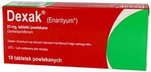 Opis Dexak jest lekiem przeciwbólowym należącym do grupy leków zwanych niesteroidowymi lekami przeciwzapalnymi (NLPZ). Wskazania Lek Dexak 25 mg jest stosowany w objawowym leczeniu bólu o nasileniu łagodnym do umiarkowanego np. bólu mięśni, bolesnego miesiączkowania, bólu zębów. Jeśli po upływie 3 - 4 dni nie nastąpiła poprawa lub jeśli pacjent czuje się gorzej, należy zwrócić się do lekarza. Składniki Substancją czynną leku jest deksketoprofen (w postaci trometamolu deksketoprofenu). Każda tabletka powlekana zawiera 25 mg deksketoprofenu. Inne składniki to: skrobia kukurydziana, celuloza mikrokrystaliczna, karboksymetyloskrobia sodowa, glicerolu distearynian, hypromeloza, tytanu dwutlenek, glikol propylenowy, makrogol 6000. Dawkowanie Ten lek należy zawsze przyjmować dokładnie tak, jak to opisano w ulotce dla pacjenta lub według zaleceń lekarza lub farmaceuty. W razie wątpliwości należy zwrócić się do lekarza lub farmaceuty. Zalecana dawka dobowa to zwykle 1 tabletka (25 mg) co 8 godzin, jednak nie więcej niż 3 tabletki na dobę (75 mg). Jeśli po upływie 3 do 4 dni nie nastąpiła poprawa lub pacjent czuje się gorzej, należy skontaktować się z lekarzem. Lekarz poinformuje pacjenta ile tabletek należy przyjmować na dobę i przez jaki okres czasu. Dawka leku Dexak będzie uzależniona od typu, ciężkości i okresu występowania bólu u pacjenta. U osób w podeszłym wieku lub z chorobami nerek lub wątroby zaleca się rozpoczynanie leczenia od mniejszej całkowitej dawki dobowej odpowiadającej nie więcej niż 2 tabletkom powlekanym (50 mg). W przypadku dobrej tolerancji u osób w podeszłym wieku tę dawkę początkową można następnie zwiększyć do dawki zalecanej dla ogólnej populacji (75 mg). W przypadku ostrego bólu, kiedy potrzebna jest szybsza ulga, zaleca się przyjmowanie leku na pusty żołądek (co najmniej 30 minut przed posiłkiem), co spowoduje szybsze wchłanianie leku. Przeciwwskazania Jeśli pacjent ma uczulenie na deksketoprofen lub którykolwiek z pozostałych składników tego leku; Jeżeli pacjent ma uczulenie na kwas acetylosalicylowy lub inne niesteroidowe leki przeciwzapalne (NLPZ); Jeżeli u pacjenta występuje astma lub w przeszłości występowały napady astmy, ostry alergiczny nieżyt nosa (krótki okres stanu zapalnego wyściółki nosa), polipy nosa (guzki we wnętrzu nosa spowodowane alergią), pokrzywka (wysypka pęcherzykowa), obrzęk naczynioruchowy (obrzęk twarzy, oczu, warg, języka lub zespół zaburzeń oddechowych) lub świszczący oddech po podaniu kwasu acetylosalicylowego lub innego leku z grupy NLPZ; Jeżeli u pacjenta w przeszłości występowały reakcje nadwrażliwości na światło słoneczne: reakcje fotoalergiczne lub reakcje fototoksyczne (w szczególności w postaci zaczerwienienia i/lub pęcherzy na skórze poddanej ekspozycji na słońce) podczas przyjmowania ketoprofenu (niesteroidowy lek przeciwzapalny) lub fibratów (leki stosowane w celu obniżenia stężenia lipidów we krwi); Jeżeli u pacjenta występuje choroba wrzodowa żołądka i (lub) dwunastnicy lub krwawienie z żołądka lub jelit lub jeśli w przeszłości występowało krwawienie z żołądka lub jelit, owrzodzenie lub perforacja; Jeżeli u pacjenta występują przewlekłe problemy trawienne (np. niestrawność, zgaga); Jeżeli u pacjenta występowało krwawienie z żołądka lub jelit lub perforacje z powodu wcześniejszego przyjęcia leków z grupy NLPZ stosowanych w leczeniu bólu; Jeżeli u pacjenta występują choroby jelit przebiegające z przewlekłym stanem zapalnym (choroba Leśniowskiego-Crohna lub wrzodziejące zapalenie jelita grubego); Jeżeli u pacjenta występuje ciężka niewydolność serca, umiarkowana lub ciężka niewydolność nerek lub ciężka niewydolność wątroby; Jeżeli u pacjenta występuje nadmierna skłonność do krwawień lub zaburzenia krzepnięcia; Jeżeli pacjent jest ciężko odwodniony (nadmierna utrata płynów z organizmu) z powodu wymiotów, biegunki lub przyjmowania niedostatecznej ilości płynów; Jeżeli pacjentka jest w trzecim trymestrze ciąży lub karmi piersią. Stosowanie leku u dzieci i młodzieży Tego leku nie należy stosować u dzieci i młodzieży w wieku poniżej 18 lat. Przechowywanie Przechowywać w temperaturze poniżej 25°C. Chronić od światła i wilgoci. Przechowywać w sposób niedostępny dla dzieci. Lek pochodzi z importu równoległego