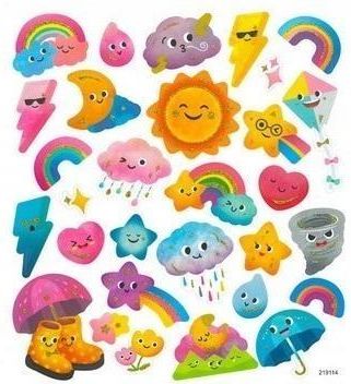 NAKLEJKI POGODA słoneczka chmurki Z BROKATEM 30szt Urocze, papierowe naklejki składające się z elementów przedstawiających rozmaite zjawiska pogodowe i pasujące motywy m.in. tęczę, słońce, chmury deszczowe, krople deszczu, gwiazdki, parasolki itp. Naklejki są w pastelowo-kredowych odcieniach i …