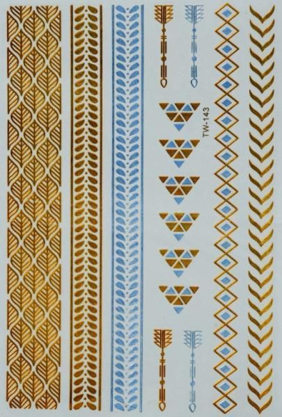 Kolekcja: JENI Wzór: J9 Kolekcja JENI – to zestawy różnorodnych tatuaży. Metaliczne tatuaże - hit nadchodzącego lata 2015! Są bardzo proste w użyciu. Stanowią wspaniały pomysł na stworzenie unikalnego zestawu biżuterii na każdą okazję. Są idealnym dodatkiem do letnich stylizacji, imprez okolicznościowych , karnawałowych czy sylwestrowych. Metaliczne tatuaże są wodoodporne i nie wchodzą w reakcje ze skórą, nie zawierają żadnych substancji toksycznych. Dobrze wykonany tatuaż utrzymuje się na ciele 5-6 dni (z wyjątkiem miejsc podatnych na zginanie lub w przypadku częstego kontaktu z wodą). Sposób aplikacji: Nakładanie tatuażu jest bardzo proste. Wystarczy wybrany motyw tatuażu przyłożyć do suchej skóry, a następnie nawilżyć go wilgotną gąbką, przycisnąć delikatnie do ciała i odczekać 30-40 sekund. Następnie delikatnie oderwać papierowy podkład i tatuaż gotowy! Wymiary arkusza: 15x24cm.