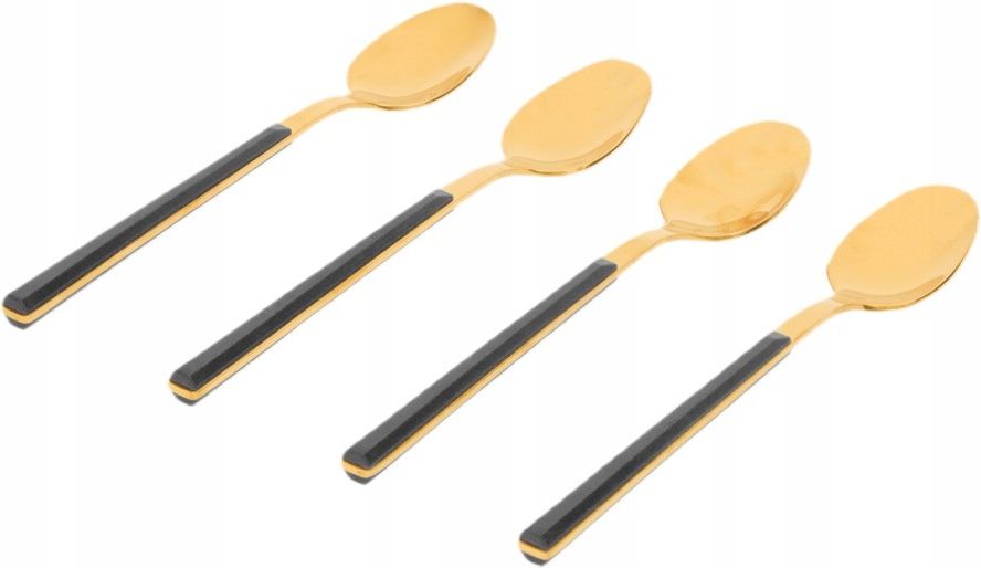 Łyżeczki deserowe – zestaw 4 sztuk Dodaj blasku każdemu przyjęciu dzięki eleganckim łyżeczki deserowym ze stylowym złotym wykończeniem. Ich wyrafinowany wygląd sprawia, że doskonale komponują się z deserami serwowanymi podczas uroczystości, spotkań towarzyskich czy codziennych chwil przy kawie. Specyfikacja Ilość : 4 szt Kolor : Złoty, Czarny Długość : 15 cm Można myć w zmywarce Idealne do deserów, kawy lub jako ozdobny element stołu