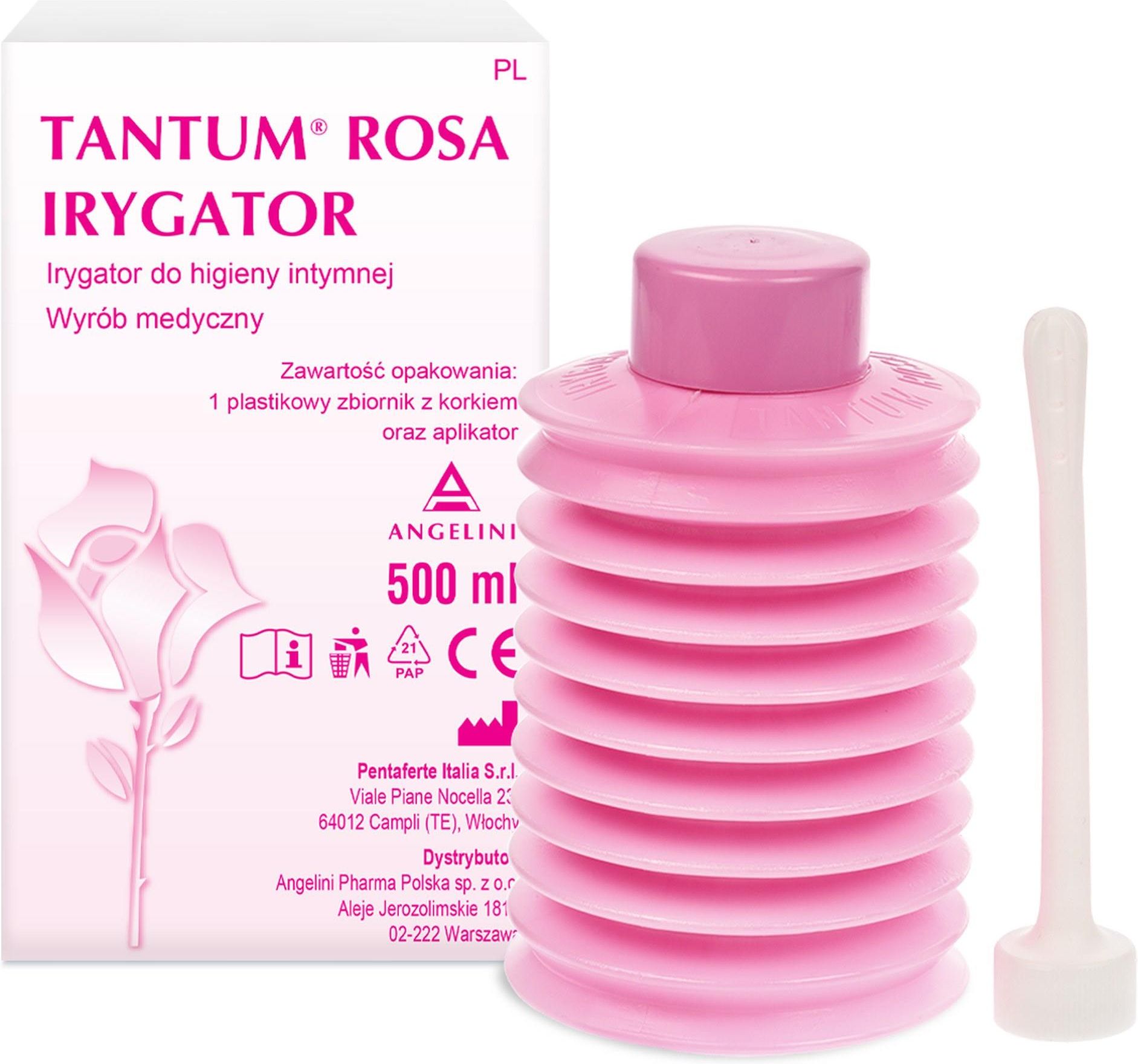 Tantum Rosa, irygator do higieny intymnej, pojemność 500 ml Irygator do płukania pochwy Tantum Rosa – opis: Irygator Tantum Rosa to wygodny pojemnik z aplikatorem do płukania pochwy i higieny intymnej o pojemności 500 ml, do wielorazowego użytku. Irygator do higieny intymnej Tantum Rosa służy do wykonywania płukania pochwy. To pojemnik wielokrotnego użytku, pomocny w miejscowym stosowaniu roztworów dopochwowych. Regularna higiena pochwy pomaga w zachowaniu prawidłowego składu flory bakteryjnej pochwy i może odpowiednio uzupełniać zalecane przez lekarza leczenie stanów zapalnych żeńskich narządów płciowych, wywołanych przez infekcje intymne, podrażnienie mechaniczne lub w profilaktyce przed- i pooperacyjnej w ginekologii. Co zawiera opakowanie irygatora do higieny intymnej Tantum Rosa Zawartość opakowania: 1 plastikowy zbiornik z korkiem oraz aplikator. Irygator ma pojemność 500 ml. Jak stosować irygator Tantum Rosa? Irygator Tantum Rosa jest bezpieczny, wykonany z elastycznego i gładkiego plastiku. Irygator może być użyty wielokrotnie. Irygator przeznaczony jest do używania przez jedną kobietę.   Irygator dopochwowy jest przeznaczony do użytku indywidualnego. Jak używać irygator do płukania pochwy? 1. Płyn do irygacji należy przygotować używając wody o temperaturze ciała. 2. Należy napełnić zbiornik przygotowanym roztworem w ilości 500 ml. 3. Na zbiornik nakręcić końcówkę irygatora (aplikator). 4. Ostrożnie wprowadzić końcówkę irygatora (aplikator) do pochwy, najgłębiej jak jest to możliwe. 5. Zbiornik należy trzymać dwoma rękoma, kciuki należy ułożyć na korku przy końcówce irygatora (aplikatorze). 6. Naciskając zbiornik doprowadzić do jego opróżnienia. 7. Jeżeli jest to możliwe irygację należy wykonać w pozycji leżącej, najlepiej w pustej wannie, lub stojącej – np. pod prysznicem. Dla bezpieczeństwa i wygody zaleca się wykonanie irygacji w bezpiecznej i stabilnej pozycji, z ewentualnym wykorzystaniem wkładki antypoślizgowej. Można również wykonać irygację w pozycji siedzącej – na bidecie lub sedesie. 8. Delikatnie wyjąć końcówkę irygatora (aplikator) z pochwy nie dopuszczając do rozprężenia się zbiornika, aby nie wsysać do zbiornika wydzieliny z pochwy. 9. Ze zbiornika odkręcić końcówkę irygatora (aplikator). 10. Obie części umyć w ciepłej (do 40°C) wodzie i odstawić do osuszenia. Ostrzeżenia i środki ostrożności • Uwaga – żadnej części irygatora nie należy myć w zmywarce. • Nie sterylizować. • Nie podgrzewać powyżej 40°C. • Nie stosować żrących środków do dezynfekcji. • Nie stosować roztworów środków drażniących oraz środków powierzchniowo czynnych (detergentów). Kobiety, które nie rozpoczęły życia seksualnego nie powinny stosować irygatora, gdyż jego użycie może spowodować przerwanie błony dziewiczej. Dystrybutor w Polsce: Angelini Pharma Polska Sp. z o.o.  Aleje Jerozolimskie 181B 02-222 Warszawa tel. (22) 70 28 200 | email: angelini@angelini.pl Producent: Pentaferte Italia S.r.l. Viale Piane Nocella 23, 64012 Campli (TE), Włochy Przed użyciem zapoznaj się z ulotką, która zawiera wskazania, przeciwwskazania, dane dotyczące działań niepożądanych i dawkowanie oraz informacje dotyczące stosowania produktu leczniczego, bądź skonsultuj się z lekarzem lub farmaceutą, gdyż każdy lek niewłaściwie stosowany zagraża Twojemu życiu lub zdrowiu.