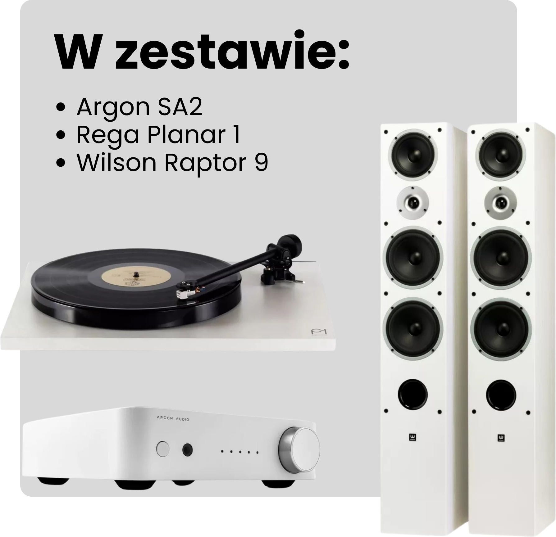 Zestaw stereofoniczny: Argon Audio SA2 + Wilson Raptor 9 + Rega Planar 1 (Carbon) Możliwość zakupu produktu w bezpłatnym systemie ratalnym 0% na 10 miesięcy! Z uwagi na prezentację wielu wariantów/opcji zestawu, gdy jest on dostępny - przed zakupem prosimy o kontakt celem ustalenia dostępności wybranych przez Ciebie wersji.