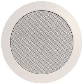 Moc 6 W Pasmo 90 Hz - 20 kHz Kąt promieniowania 180° CNBOP CE CPD Opisywany model posiada pojedynczy, 2-membranowy głośnik o mocy 6 W połączony z okrągłą ażurową osłoną metalową. Transformator dopasowujący 100 V umieszczony jest z tyłu. Głośnik posiada neutralny biały kolor zgodny z RAL i wygląd pasujący do każdego wnętrza. Głośnik posiada wbudowane zabezpieczenie, które powoduje, że w przypadku pożaru uszkodzenie głośnika nie spowoduje awarii w całym dołączonym obwodzie. W ten sposób zachowana zostanie integralność systemu, dzięki której głośniki w innych obszarach będą dalej mogły być wykorzystywane do informowania o bieżącej sytuacji. Głośnik posiada ceramiczny zespół zacisków, bezpiecznik termiczny oraz odporne na wysoką temperaturę okablowanie. Wszystkie głośniki firmy Bosch są tak skonstruowane, aby zapewnić nieprzerwaną emisję dźwięku o mocy znamionowej przez 100 godzin, co jest zgodne z wymaganiami normy IEC 268-5 (PHC). Firma Bosch opracowała specjalny test symulujący wystąpienie dodatniego sprzężenia akustycznego (SAFE – Simulated Acoustical Feedback Exposure), aby pokazać, że jej głośniki są w stanie emitować bez uszkodzenia przez krótki czas moc dwa razy większą od ich mocy znamionowej. Zapewnia to niezawodność działania nawet w warunkach ekstremalnych, co daje większe zadowolenie klienta, większą trwałość urządzenia i o wiele mniejsze prawdopodobieństwo uszkodzenia lub obniżenia jakości reprodukowanego dźwięku podczas eksploatacji. Głośnik może zostać łatwo i szybko zainstalowany w otworze w suficie podwieszanym dzięki oddzielnemu pierścieniowi montażowemu z trzema sprężynującymi uchwytami (w przypadku sufitów podwieszanych i płyt ściennych o grubości od 9 do 25 mm). Uchwyty posiadają osłony gumowe zabezpieczające przed uszkodzeniem delikatnego materiału sufitu. Głośnik jest dostarczany wraz z odpowiednim szablonem do wycięcia otworu montażowego o śr. 196 mm. Głośnik utrzymuje się w pierścieniu mocującym za pomocą mocowania bagnetowego. Moduł posiada 3-stykowy zespół zacisków śrubowych do łączenia szeregowego okablowania. 4 odczepy na uzwojeniu pierwotnym transformatora umożliwiają ustawienie maksymalnej mocy wyjściowej na wartość znamionową, połowę tej mocy lub ćwiartkę (czyli co 3 dB).