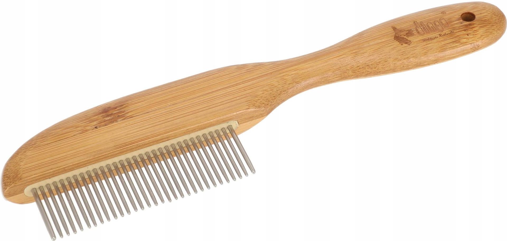 DINGO Grzebień z bambusową rączką 41 obrotowych igieł 21,4 x 5,5 cm Grzebień z bambusową rączką. ZALETY: - pomaga usunąć martwy włos, - sprzyja pielęgnacji skóry i szaty psa, - obrotowe zęby ułatwiają usuwanie kołtunów, - wzmacnia sierść i zapobiega nadmiernemu wypadaniu, - nadaje się do codziennej pielęgnacji, - wykonany z bambusu, Niezwykle ważną czynnością w pielęgnacji psów jest czesanie i dbanie o ich sierść. Dzięki regularnemu wyczesywaniupobudzisz krążenie krwi w skórze, a usuwając martwe włosy znacząco wpłyniesz na wygląd futra. Dodatkowo, dzięki częstemu czesaniu można szybko wykryć obecność pasożytów w okrywie włosowej. Wykonany z naturalnego, ekologicznego włókna bambusowego grzebień z 41 obrotowymi zębami to produkt, który sprzyja dbaniu nie tylko o psa ale też o środowisko. Dzięki obrotowym igłom usuwanie kołtunów i martwego podszerstka u długowłosych czworonogów jest bardzo łatwe. Regularne wyczesywanie martwego włosa ogranicza gromadzenie się sierści w domu a codzienna pielęgnacjawzmocni włos oraz skórę Twojego pupila. WYMIARY: - 21,4 x 5,5 cm ID:40574