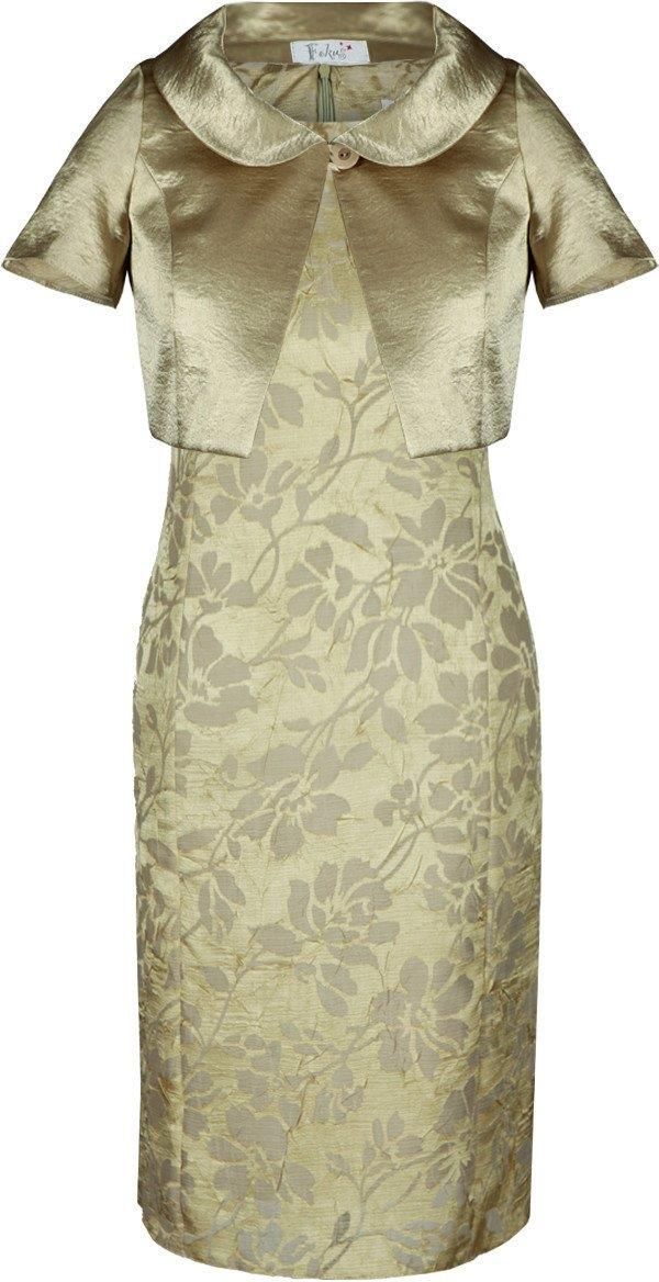 Sukienka: midi, prosta dekolt okrągły szerokie ramiączka suwak kryty z tyłu rozporek z tyłu tkanina wzorzysta, podszewka Żakiet: krótki kołnierz okrągły zapięcie guzik rękaw krótki tkanina atłas