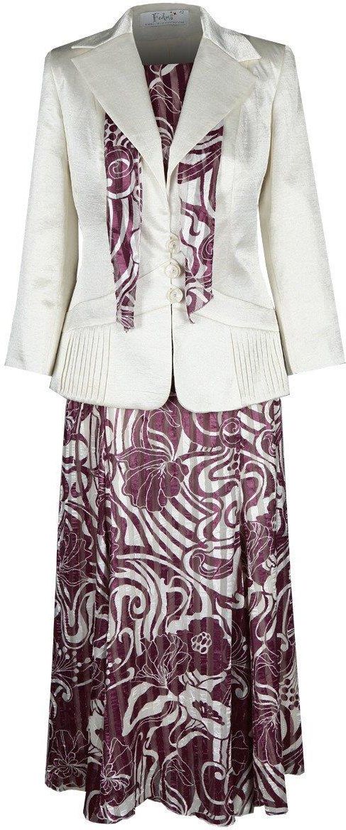 Spódnica: dł. 7/8, rozkloszowana, godety suwak kryty z tyłu tk. wzorzysta, podszewka Bluzka: dekolt okrągły suwak kryty z boku rękaw motylek tk. wzorzysta, podszewka Żakiet: dekolt szpic, kołnierz zapięcie guziki rękaw 3/4 tk. z połyskiem, podszewka