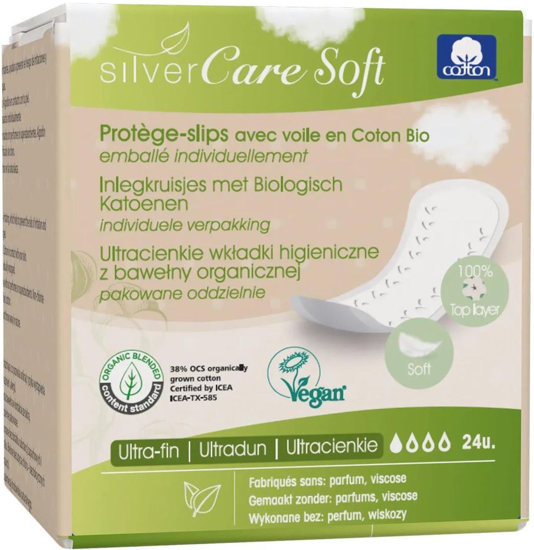 Ekologiczne wkładki higieniczne o anatomicznym kształcie, ultracienkie, wykonane z czystej, naturalnej bawełny, niebielone chlorem i w 100% biodegradowalne. Jedyne wkładki higieniczne na rynku pakowane w pojedyncze saszetki! Eko wkładki bawełniane, bez chloru SOFT to najzdrowszy dla Ciebie i środowiska naturalnego produkt spośród dostępnych na rynku produktów naturalnych do higieny intymnej. Dlaczego warto wybrać ekologiczne wkładki bawełniane SOFT Silver Care? Mają o 30% większą chłonność niż podobne produkty innych marek naturalnych. Wkładki hipoalergiczne i bez substancji zapachowych - doskonałe dla alergików i kobiet ze skórą wrażliwą i skłonną do podrażnień. Niebielone chlorem, ale wodą utlenioną. Bawełniane wkładki higieniczne bez plastiku oraz substancji syntetycznych i petrochemicznych. Najzdrowsze wkładki higieniczne - całkowicie wolne od dioksyn. Bez perfum mogących wywoływać alergie lub podrażnienia. Bez celulozy, której proces produkcyjny jest szkodliwy dla środowiska Jedwabista zewnętrzna powłoka posiada specjalny przeplot zapobiegający przyklejaniu się do skóry włókien bawełny. Wyjątkowo miękkie, dyskretne i dopasowujące się do kształtu ciała - dla komfortu i swobody każdego dnia. Zapewniają doskonałą wentylację, pozwalają skórze oddychać. Pakowane w pojedyncze saszetki - dla większej higieny i wygody. Owijki bawełnianych wkładek wykonane są z kompostowalnego biofilmu, z bezpiecznym klejem spożywczym. Ekologiczne wkładki higieniczne w 100% ulegają biodegradacji - włącznie z owijką i opakowaniem zewnętrznym. W kontakcie ze skórą tylko czysta, miękka, naturalna bawełna z upraw certyfikowanych. Wkładki ekologiczne bez chloru Silver Care SOFT są produkowane z bawełny uprawianej bez użycia pestycydów, herbicydów czy chemicznych nawozów. Produkt odpowiedni dla wegan, nietestowany na zwierzętach. Testowane klinicznie. Ginekolodzy i położne zalecają stosowanie naturalnych produktów bawełnianych do higieny intymnej. Badania naukowe wskazują, że używanie produktów z certyfikowanej bawełny organicznej - bez dioksyn i substancji zapachowych - może zmniejszyć podrażnienia i zmniejszyć nasilenie objawów endometriozy. Optymalna ochrona każdego dnia. Wkładki ekologiczne Silver Care SOFT nie zawierają: perfum, wiskozy, celulozy, plastiku, chloru, dioksyn. Na naszych aukcjach znajdziesz również inne modele bawełnianych wkładek higienicznych bez chloru Silver Care: Wkładki higieniczne o anatomicznym kształcie Elastyczne wkładki higieniczne - do noszenia również z bielizną typu stringi Ultracienkie wkładki oddzielnie pakowane Produkty Masmi i Silver Care różnią się wyłącznie opakowaniem zewnętrznym, produkt jest ten sam. W przypadku braku jednego rodzaju w zamówieniu wysłany zostanie odpowiednik drugiej marki.