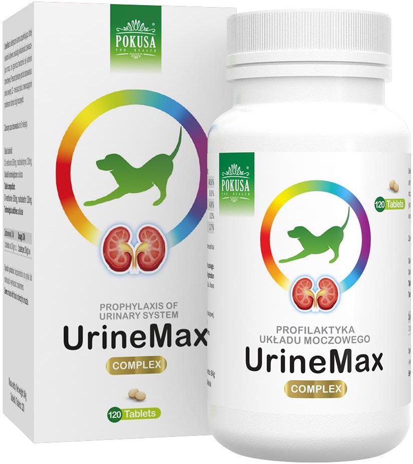 Pokusa GreenLine UrineMax 120tabl. Preparat uzupełniający dla psów, którego składniki aktywne posiadają właściwości zakwaszające mocz, dzięki czemu ograniczają tworzenie się kamieni struwitowych. Polecany jest do stosowania u psów powyżej 12 - miesiąca życia z nawracającymi problemami dolnych dróg moczowych. Zalecany czas stosowania: do 6 miesięcy.Zastosowanie: Profilaktyka układu moczowego Infekcje układu moczowego Schorzenia nerek Kamienie struwitowe Skład tabletki: DL-metionina 500mg, maltodekstryna 130mgDodatki technologiczne: celuloza.Składniki analityczne/100g:Białko: 40.6%Tłuszcze: 0.6%Włókno: 4.8%Popiół surowy: 0,3%Wilgotność: 1.7%Dawkowanie: 1 tabletka na 10 kg masy ciała.Sposób podania: zmieszać z pokarmem lub bezpośrednio do pyska