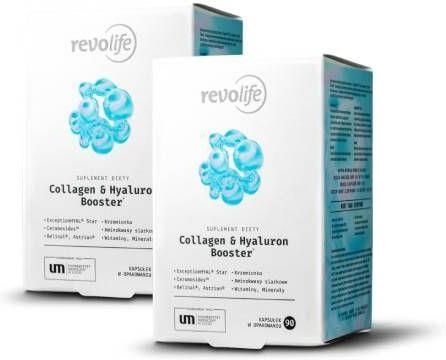 Zestaw Revolife Collagen & Hyaluron Booster - Suplement diety z ekstraktami roślinnymi, ceramidami, kwasem hialuronowym, aminokwasami siarkowymi, składnikami mineralnymi i witaminami.