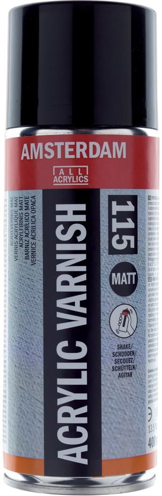 Talens Amsterdam Acrylic Varnish Matt Werniks akrylowy ochronny trwała ochrona obrazów wykonanych farbą akrylową (werniks wykończeniowy) skład: żywica akrylowa, terpentyna, olej terpentynowy, składnik matujący (krzemionka) nakładać po całkowitym wyschnięciu powłoki farby (w przypadku normalnej grubości warstwy po 4-5 dniach) nadaje matowy efekt przed użyciem mocno wstrząsnąć w przypadku użycia pędzla nakładać jedną warstwę i rozprowadzać w jednym kierunku schnie w ciągu kilku godzin nie blaknie możliwość rozcieńczenia z terpentyną; pędzle czyścićterpentyną suche warstwy werniksu można usuwać terpentyną. pojemność: 400 ml spray produkt holenderskiej firmy Talens