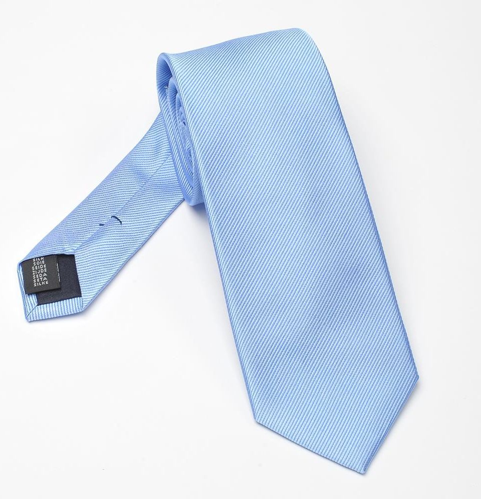 Klasyczny jedwabny krawat w kolorze błękitnym i delikatnym skośnym splocie jedwabiu. Pasuje do białej lub różowej koszuli, gładkiej w kratkę lub paski i granatowej marynarki. Błękitny krawat bardzo dobrze sprawdzi się w stylizacji ślubnej ponieważ nadaje lekkości i świeżości. Błękit jest uważany również za kolor ślubny. Gładki krawat jest zawsze bardzo uniwersalny, można go więc nosić na co dzień do pracy czy na różne okazje.