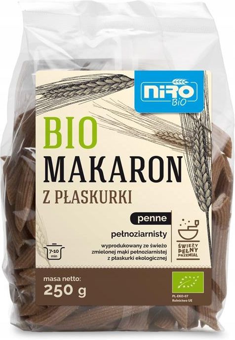 SKŁADNIKIświeżo zmielona mąka z pszenicy płaskurkix (100%), woda (xcertyfikowany składnik ekologiczny) WARTOŚĆ ODŻYWCZA W 100 gWartość energetyczna: 1274 kJ / 304 kcalTłuszcz: 2 gw tym kwasy tłuszczowe nasycone: 0,5 gWęglowodany: 61 gw tym cukry: 1,6 gBłonnik: 9,6 gBiałko: 13 gSól: 0,0004 g SPOSÓB PRZYGOTOWANIAGotować 7-10 minut UWAGIZawartość soli wynika wyłącznie z obecności naturalnie występującego sodu. ZALECANE WARUNKI PRZECHOWYWANIAPrzechowywać w suchym i chłodnym miejscu. SZCZEGÓŁY PRODUKTUWEGETARIAŃSKI: WEGETARIAŃSKIWEGAŃSKI: WEGAŃSKICERTYFIKAT BIO: jestProducent - nazwa i adres: PRZEDSIĘBIORSTWO PRODUKCYJNO USŁUGOWO - HANDLOWE NIRO SP. Z O.O. , DOLNA 4, 42-283 BORONÓWKraj Producenta: PolskaTworzywo op. jednostkowego: Folia