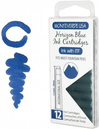 Monteverde Atrament do Piór Wiecznych Horizon Blue Naboje 12 x Uniwersalne Naboje Atrament - Horizon Blue Monteverde USA jest światowym liderem najnowszej technologii produkcji tuszu - ITF ? (Ink Treatment Formula), która znacznie poprawia jakość przepływu atramentu w piórach wiecznych. Ponadto: smaruje i chroni systemy z podawaniem tuszu przed korozją i zatykaniem, poprawia czas schnięcia atramentu na papierze, występuje w szerokiej gamie żywych kolorów, które zapewniają niespotykane doświadczenie pisania, pasują do większości piór