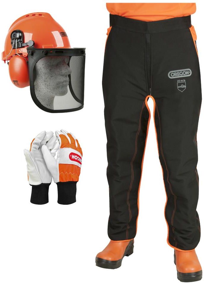 Zestaw ochronny do pił Oregon 574742A zawiera kask, nogawice i skórzane rękawice w rozmiarze 10/L. Optymalny zestaw do pracy piłą łańcuchową.