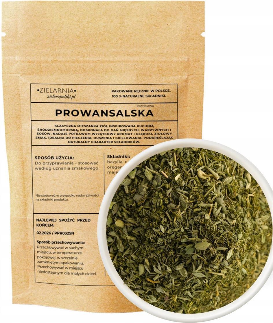 PROWANSALSKA – Zioła prowansalskie w autorskiej odsłonie Nasza mieszanka Prowansalska to klasyczne połączenie ziół śródziemnomorskich, idealne do dań kuchni francuskiej, włoskiej i wegetariańskiej. Aromatyczna kompozycja bazylii, oregano, rozmarynu i tymianku świetnie komponuje się z warzywami, mięsem i sosami. Zastosowanie: do potraw warzywnych, dań z makaronem, mięs duszonych i pieczonych. Składniki: bazylia, cząber, rozmaryn, oregano, tymianek, majeranek, szałwia Sposób przechowywania: Przechowywać w suchym miejscu, w temperaturze pokojowej w szczelnie zamkniętym opakowaniu. Przechowywać w miejscu niedostępnym dla małych dzieci. Produkt 100 % naturalny. Pakowany ręcznie w Polsce. Zawartość netto: 40 g Zdjęcia ziół mogą być zdjęciami symbolicznymi lub propozycją podania. Informację o ziołach nie stanowią porady medycznej. Wyprodukowano w Polsce dla:PERSEA SP. Z O.O. Rakowiecka 5/37, 02-517 Warszawa
