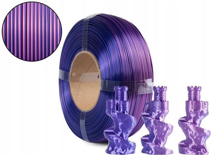 Filament Spectrum ReFill PLA Magic SILK 1.75mm MAGENTA DREAM 1kg Spectrum Magic SILK PLA Magia kolorów - Twoje wydruki w nowym wymiarze Spectrum Magic SILK PLA to innowacyjny filament do druku 3D, który przekształca Twoje projekty w prawdziwe dzieła sztuki, dzięki niesamowitemu efektowi zmiany kolorów. Wykorzystując nowoczesną technologię koekstruzji, Magic SILK PLA łączy dwa kolory w jednej nici, tworząc zachwycające przejścia barw i dynamiczne efekty świetlne. Każdy wydruk wykonany z tego filamentu mieni się kolorami w zależności od kąta patrzenia i oświetlenia, nadając Twoim modelom głębię i wyjątkowy charakter. Magic SILK PLA oferuje gładką, połyskującą powierzchnię, która nie tylko przyciąga wzrok, ale także dodaje elegancji każdemu projektowi. Jego wyjątkowe właściwości sprawiają, że jest łatwy w obsłudze i kompatybilny z większością drukarek 3D wykorzystujących technologię FDM/FFF, co czyni go idealnym wyborem zarówno dla początkujących, jak i zaawansowanych użytkowników. Filament charakteryzuje się doskonałą precyzją wydruków. Wydruki wykonane z Magic SILK PLA najlepiej prezentują się w modelach o bogatej szczegółowości, gdzie efekt zmiany kolorów jest najbardziej imponujący. Dzięki Magic SILK PLA Twoje projekty zyskają nowy, niespotykany wymiar, wprowadzając element magii i innowacji do każdego dzieła. Ten dwukolorowy filament to niezastąpiony wybór dla designerów, artystów oraz entuzjastów druku 3D, którzy pragną wzbogacić swoje prace o wyjątkowy, magiczny efekt. Zastosowanie Sztuka dekoracyjna Projektowanie wnętrz Projekty edukacyjne Prototypowanie Kluczowe cechy Technologia koekstruzji: dwa kolory w jednej nici Dynamiczne przejścia barw w zależności od kąta patrzenia Efekt zmiany kolorów Gładka, jedwabista powierzchnia wydruków Wysoka estetyka i wyjątkowy charakter modeli Kompatybilność z większością drukarek 3D FDM/FFF Łatwość druku Dane techniczne Temperatura drukowania: 210-240°C Podgrzewany stół: wymagany Temperatura stołu: 40-60°C Prędkość druku: 40-150mm/s Ogrzewana komora robocza: niewymagana