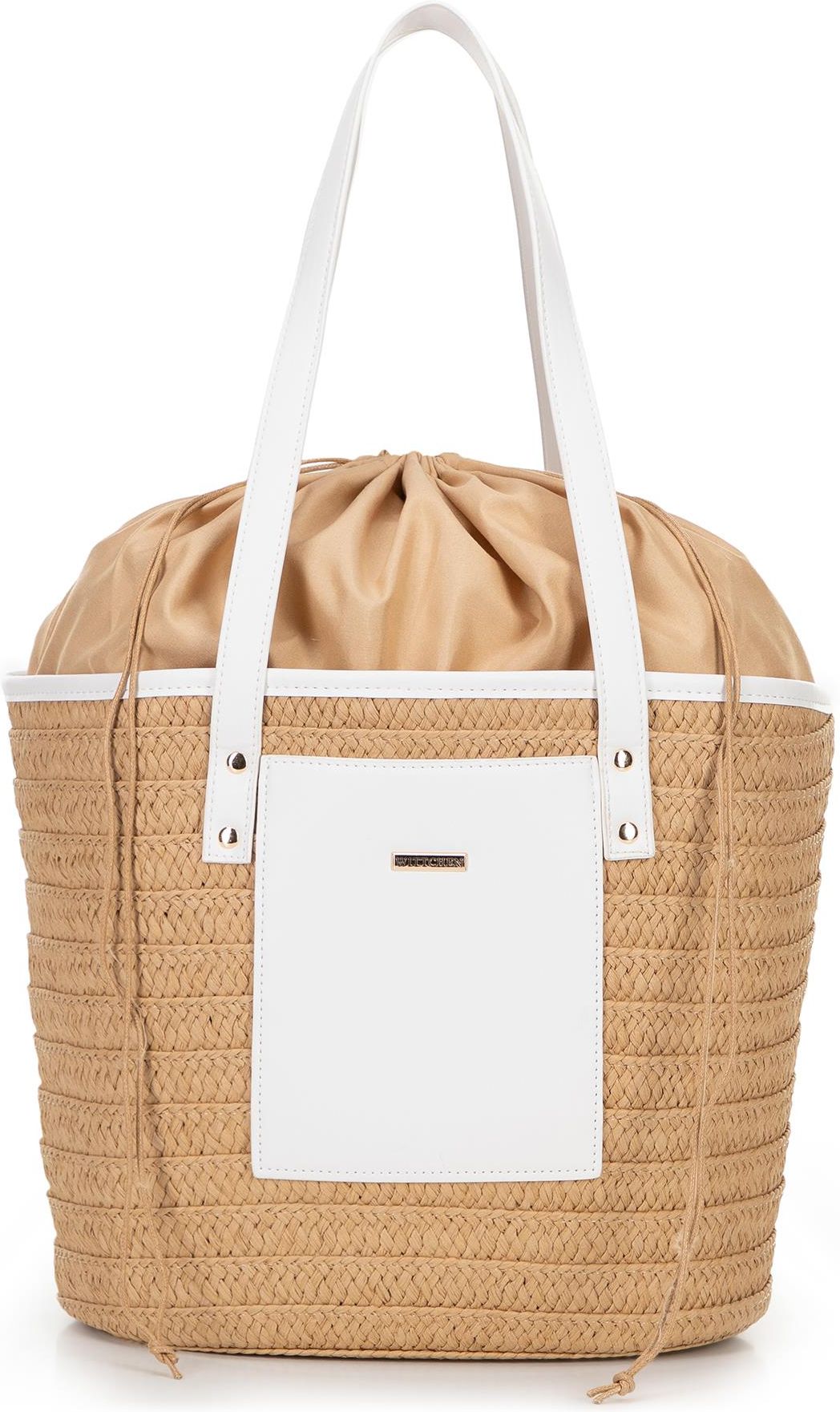 Letni koszyk z papierowej słomy – lekka i stylowa torebka na ciepłe dni Ta damska torebka typu koszyk to kwintesencja letniego stylu i swobody. Korpus wykonany ze słomy papierowej, zachwyca swoją plecioną strukturą i naturalnym wyglądem. Na przodzie znajduje się subtelne logo producenta umieszczone na naszywce oraz mała kieszonka na drobiazgi. Wnętrze torebki zostało wykończone podszewką z poliestru, którą można ściągnąć za pomocą troczków, chroniąc zawartość przed rozsypaniem. Dla kogo? Jeśli szukasz letniej torebki, która będzie jednocześnie stylowa, pojemna i wygodna – ten model spełni wszystkie oczekiwania. Idealna na plażę, zakupy czy spacer po mieście. Nasza rada: Zestaw ją z jasnymi jeansami typu mom fit, topem na cienkich ramiączkach i espadrylami na platformie lub skórzanymi klapkami. Całość uzupełnij słomkowym kapeluszem i dużymi okularami przeciwsłonecznymi. Kluczowe cechy: Materiał: Słoma papierowa w korpusie torebki to lekki i przewiewny materiał, który doskonale wpisuje się w letni klimat. Wstawka z ekoskóry z logo producenta: Eleganckie wykończenie, które podkreśla estetykę modelu. Dwie rączki z ekoskóry: Wygodne uchwyty wykonane z trwałego materiału, który dobrze leży w dłoni i na ramieniu. Praktyczne wnętrze: Jedna otwarta kieszeń wewnątrz jest idealna na drobne przedmioty. Skład: 100% słoma papierowa; podszewka: 100% poliester; rączki i wstawka: ekoskóra. Wygodne i funkcjonalne rozwiązania: Podszewka ściągana na troczki: Praktyczne rozwiązanie, które pozwala zamknąć torebkę bez klasycznego zapięcia. Dodatkowa kieszeń na przodzie: To praktyczne miejsce na rzeczy, do których potrzebujesz szybkiego dostępu. Usztywniane dno: Stabilna podstawa, która zapobiega odkształceniom i pozwala torebce zachować formę nawet po odstawieniu. Podkreśl letni charakter swoich stylizacji i postaw na koszyk, który łączy wygodę z ponadczasowym stylem!