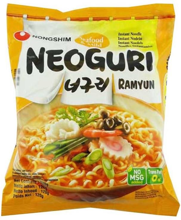 ProOrient Chińska Zupka Neoguri (Owoce Morza) Mild 120g Chińska zupka Neoguri Mild to danie błyskawiczne o smaku owoców morza. Makaron należy ugotować, jednak efekt jest o niebo lepszy, niż w przypadku zupek, które wystarczy zalać wrzątkiem. Makaron jest grubszy, a przyprawy nadają lepszego smaku. Prawdziwa koreańska zupka idealnie nadaje się, aby zjeść szybko i smacznie. W opakowaniu znajduje się makaron, bulion w proszku oraz suszone owoce morza i warzywa.  Skład:  Makaron: mąka pszenna (65%), olej palmowy, skrobia ziemniaczana, sól, mąka kukurydziana.  Proszek do zupy: sól, wzmacniacz smaku: E621, E627, E631, cukier, sos sojowy sproszkowany (sól, soja), przyprawy (proszek z czerwonej papryki, czarny pieprz w proszku, czosnek, proszek cebulowy), glukoza, przyprawa owoców morza (bonito, anchois). Płatki warzywne: smażone pszenne kulki (jajko, krewetki), suszone zielona cebulka.