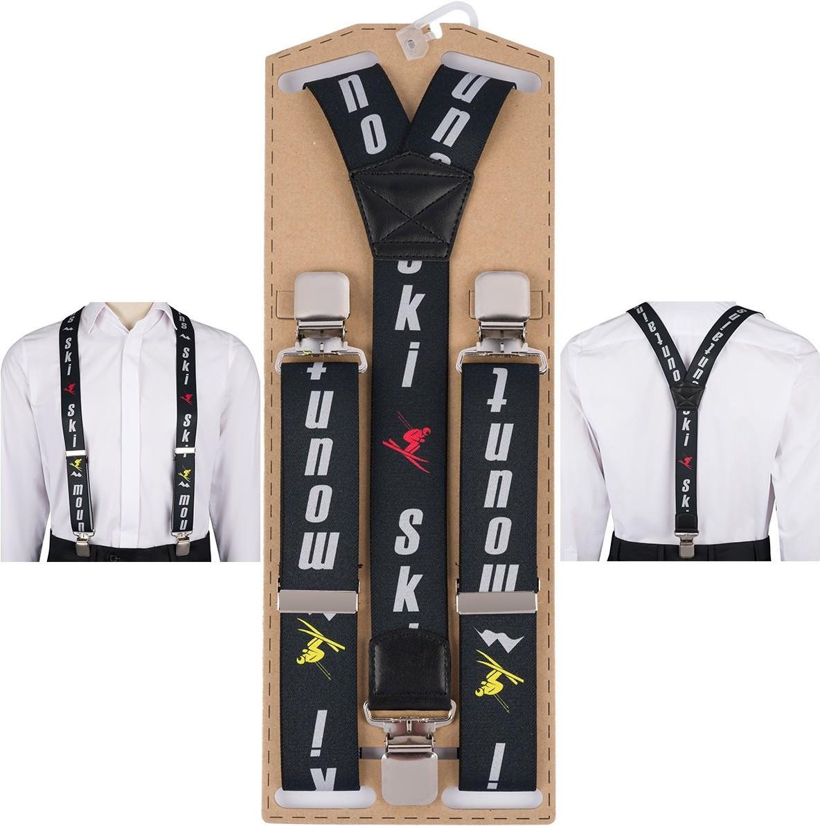 Kolory wielokolorowy Materiał Poliester Długość (cm) 4 Waga(kg) 0,3 Wzór dominujący Bez wzoru Pudełko Tak galanteria skórzana, moda męska, pasek męski, pasek ze skóry, galanteria do pracy, pasek czarny, beltimore, pasek skórzany męski, szelki, szelki skórzane, szelki beltimore Eleganckie szelki męskie narciarskie w czarnym kolorze z nadrukowanymi napisami SKI MOUNTAIN I narciarzami- zimowy wzór – szerokie, w kształcie litery V, z regulacją długości Odkryj najwyższej jakości szelki męskie, które łączą funkcjonalność z wyjątkowym stylem. Model w eleganckim, zimowym, sportowym wzorze, zapakowany w pudełko prezentowe to doskonały wybór zarówno na co dzień, jak i na specjalne okazje. Wyjątkowe cechy produktu: Materiał premium: Szelki zostały wykonane z trwałej i elastycznej tkanej gumy galanteryjnej o szerokości 4 cm, co zapewnia komfort noszenia. Stylowe detale: Wstawki z ekoskóry dodają całości elegancji, czyniąc szelki idealnym uzupełnieniem każdej stylizacji. Wytrzymałe klamry: Metalowe zapięcia solidnie trzymają spodnie, gwarantując niezawodność nawet w intensywnym użytkowaniu. Regulowana długość: Możliwość dopasowania długości w zakresie od 75 cm do 110 cm (bez rozciągania) sprawia, że szelki idealnie dopasują się do różnych sylwetek. Te szelki męskie to praktyczny i stylowy dodatek, który doskonale sprawdzi się zarówno jako prezent, jak i dopełnienie Twojej garderoby.