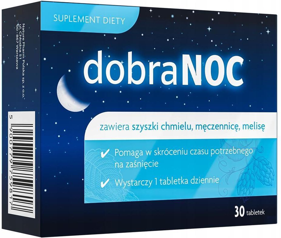 Nature Pharm Dobranoc 30 tabletek na sen melisa i szyszki chmielu Nature Pharm Dobranoc to suplement diety w formie tabletek, który zawiera szyszki chmielu, męczennicę oraz melisę. Produkt przeznaczony dla osób dorosłych. Składniki Substancja wypełniająca: celuloza; magnez (węglan magnezu); ekstrakt z szyszek chmielu zwyczajnego (Humulus lupulus L.) DER 4:1; ekstrakt z ziela melisy lekarskiej (Melissa officinalis L.) DER 10:1; ekstrakt z ziela męczennicy cielistej (Passiflora incarnata L.) DER 4:1; substancje przeciwzbrylające: sole magnezowe kwasów tłuszczowych, dwutlenek krzemu; witamina B6 (chlorowodorek pirydoksyny); melatonina. Jedna tabletka zawiera 80 mg ekstraktu z szyszek chmielu zwyczajnego (Humulus lupulus L., DER 4:1), 60 mg magnezu (co stanowi 16% Referencyjnej Wartości Spożycia), 14,4 mg ekstraktu z ziela męczennicy cielistej (Passiflora incarnata L., DER 4:1), 24 mg ekstraktu z ziela melisy lekarskiej (Melissa officinalis L., DER 10:1), 1 mg witaminy B6 (71,43% RWS) oraz 0,5 mg melatoniny. Masa netto 23,5 g Zalecane dzienne spożycie Dorośli: 1 tabletka