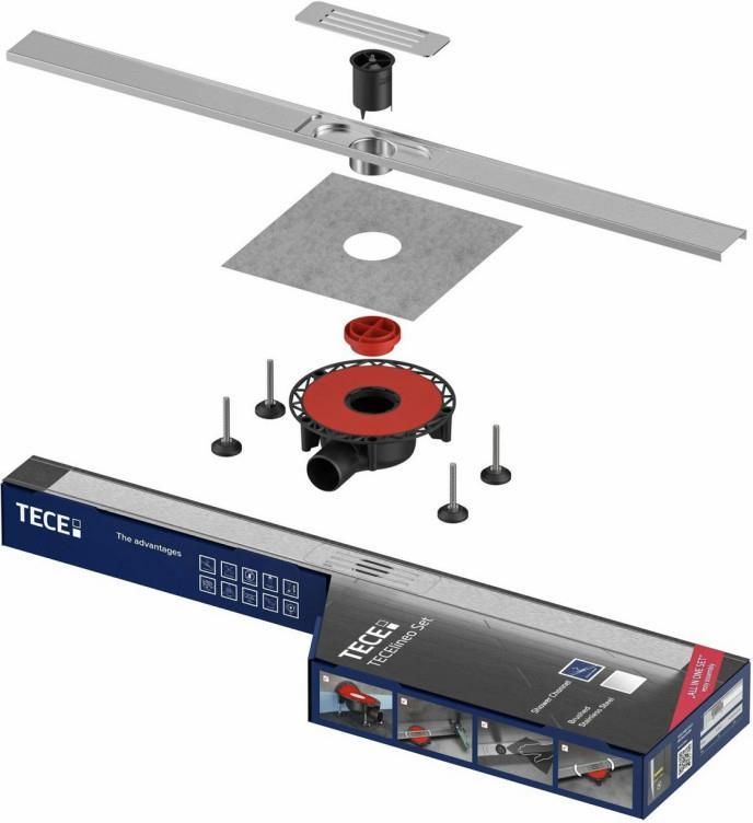 TECElineo zestaw profilu prysznicowego, stal nierdzewna szczotkowana, 1000 mm Profil prysznicowy do odpływu prysznicowego, do montażu w kleju do płytek, ponad jastrychem i uszczelnieniem zespolonym. Zawartość zestawu : Odpływ liniowy prysznicowy z możliwością docięcia na długość, z wewnętrznym spadkiem dla poprawy odpływu wody i efektu samooczyszczaenia Pokrywa profilu Odpływ z kołnierzem na zawiasach do instalacji równo ze ścianą. Pozioma rura przyłączeniowa do przyłącza odpływu DN 50, w tym pokrywa ochronna na czas budowy i syfon membranowy Tuleja uszczelniająca do wykonania uszczelki zespolonej Stopki montażowe dla łatwej regulacji wysokości i zamocowania podczas instalacji odpływu Cechy: Profil prysznicowy można skrócić do ≥ 400 mm Min. wysokość montażowa 75 mm (od dolnej krawędzi odpływu do górnej krawędzi jastrychu) Pokrywa profilu o wytrzymałości na obciążenie zgodnej z klasą obciążenia K3 — obciążenie kontrolne 300 kg Odpływ prysznicowy i pokrywa profilu ze stali nierdzewnej, materiał 1.4301 (304) Do pokryć podłogowych o grubości 8-18 mm (wliczając warstwę kleju) Do instalacji równo ze ścianą z pokryciami ściennymi od 10 mm (w tym warstwa kleju) Do instalacji z dowolnym odstępem od ściany Wydajność odpływowa ≥ 0,5/≥ 0,6 l/s (zgodnie z normą EN 1253 przy wysokości spiętrzenia wody 10/20 mm ponad pokrywę profilu) Wysokość wody stojącej 25 mm Wyjmowany syfon membranowy Proszę zamawiać oddzielnie Mata wygłuszająca Drainbase (opcjonalnie)