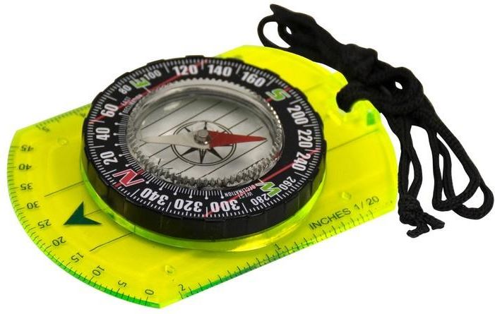 Składany kompas turystyczny do nawigacji z użyciem mapy, wyposażony we fluorescencyjną podstawę, wypełnioną cieczą tarczę, obrotowy pierścień ze skalą deklinacyjną, linijkę i skalę kątową.