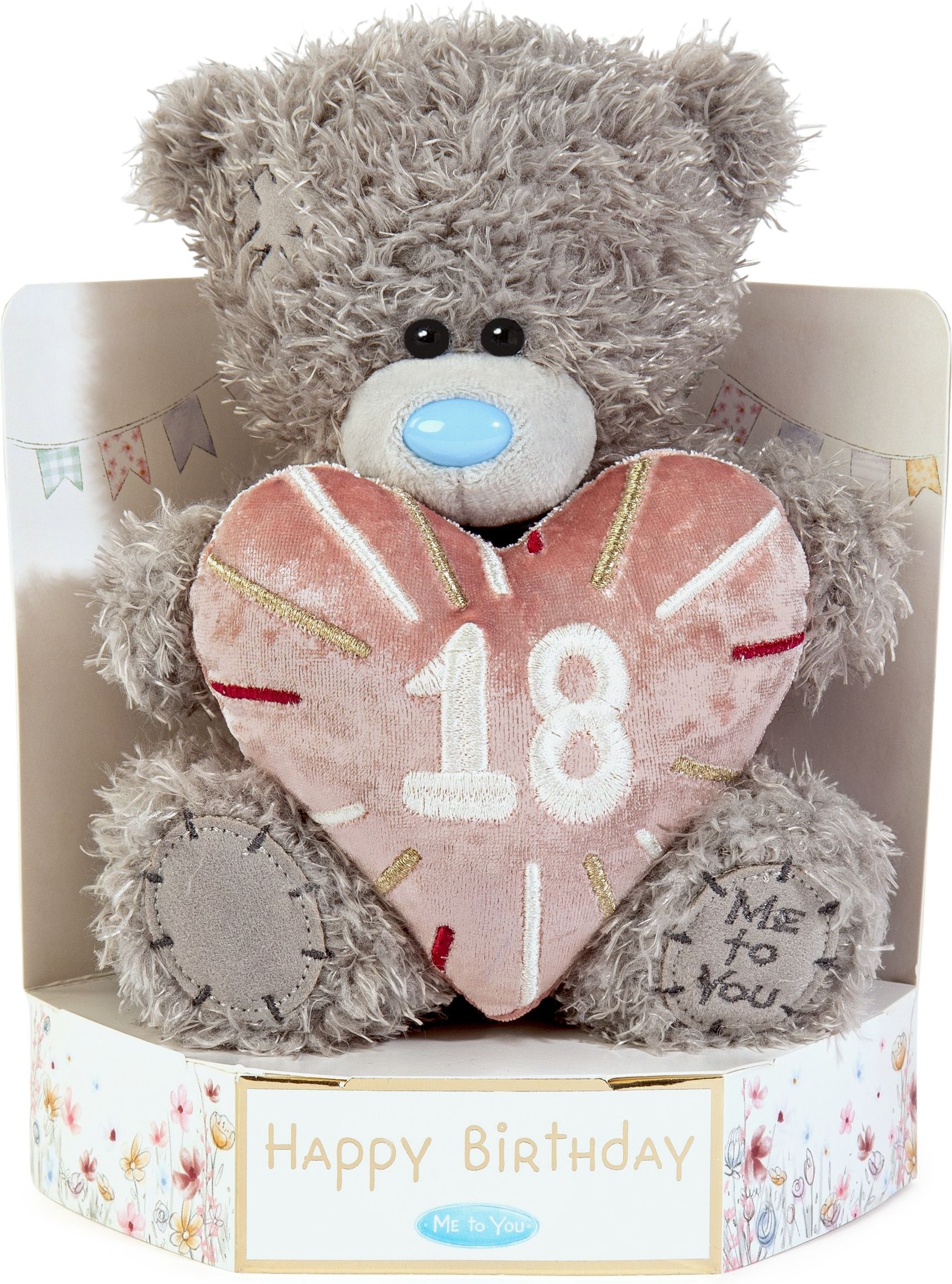 Uczcij wyj±tkowe 18. urodziny w niezapomniany sposób z tym 18-centymetrowym misiem urodzinowym. Kultowy Tatty Teddy, z miękkim szarym futerkiem, charakterystycznym niebieskim noskiem i uroczymi łatkami, trzyma w łapkach delikatne, wy¶ciełane różowe serduszko z wyhaftowan± liczb± "18" - symbolem …