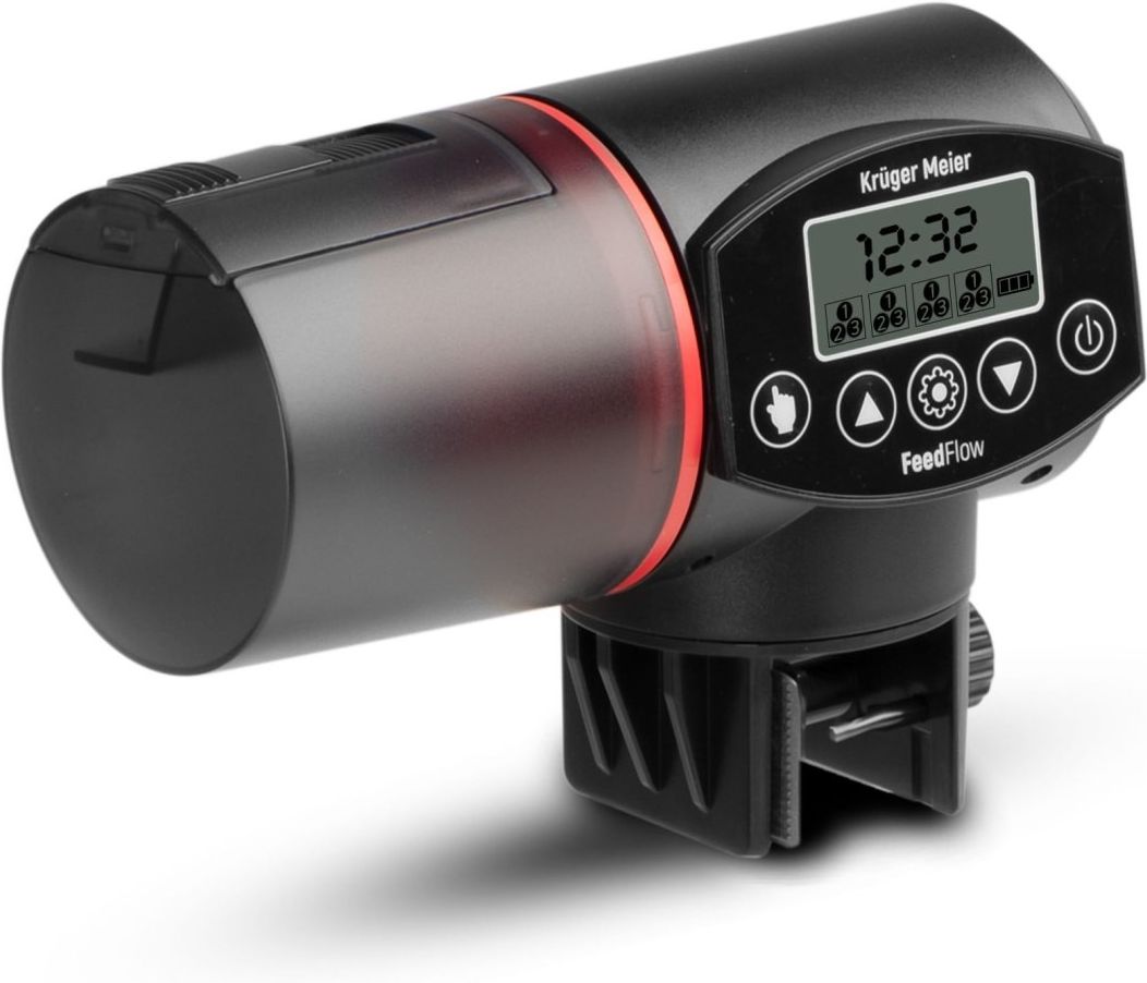 Kruger Meier FeedFlow - karmnik automatyczny Automatyczny karmnik do akwarium 200 mlz wyświetlaczem LCDi bardzo cichą pracą. Umożliwia do 4 karmień dziennie, z regulacją ilości porcji (1–3 dawki) oraz precyzyjnym ustawieniem ilości pokarmu. Przeznaczony do granulek i płatków. Dwa sposoby montażu – …