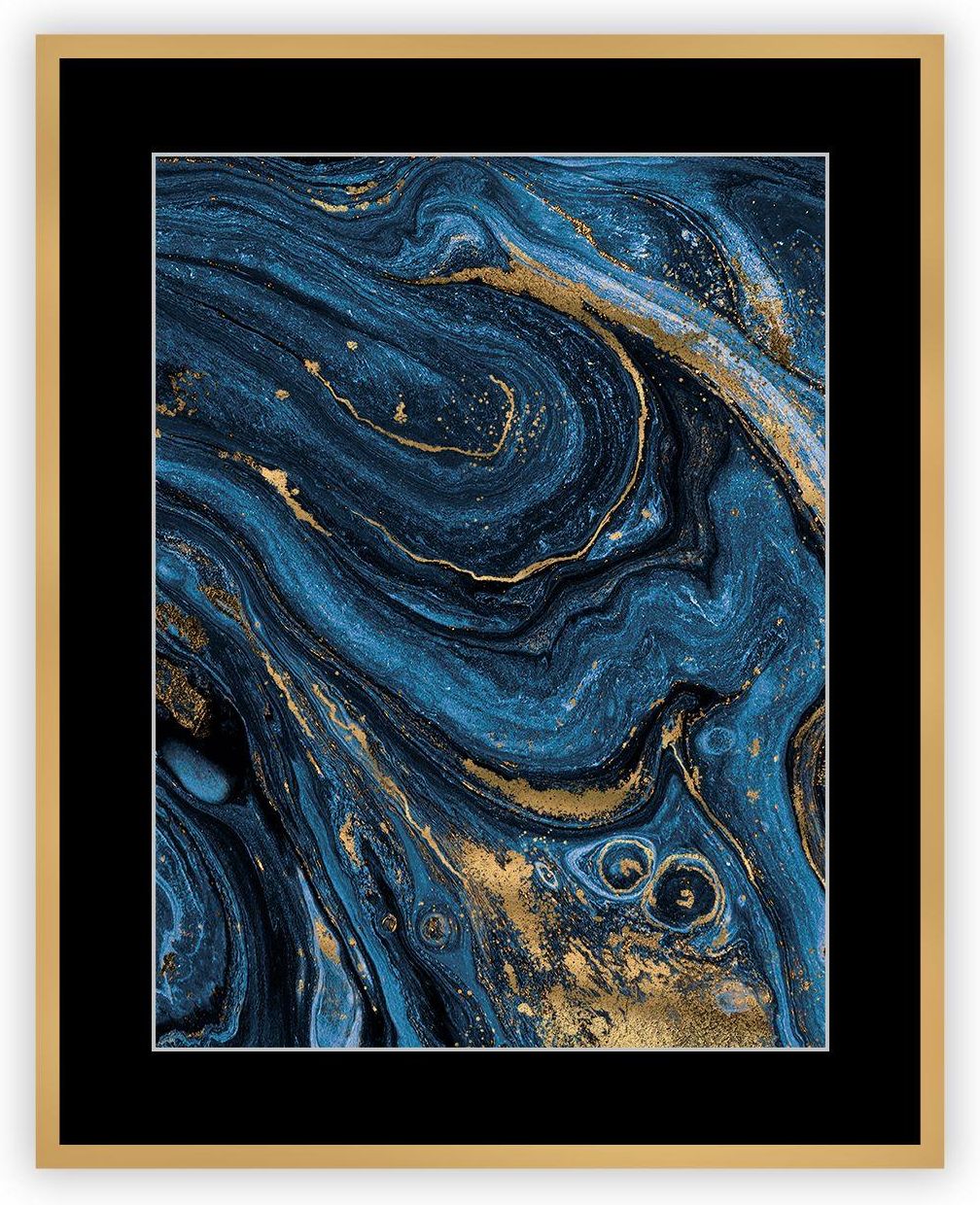 Obraz Abstract Blue&Gold II, 40 x 50cm Kod produktu: 183-052-00 Oryginalny obraz przedstawia głębie oceanu, wykonany metodą pouringu. Zwraca uwagę wyjątkową tajemniczością oraz pięknymi barwami. Zdobiony efektownym złoceniem orazoprawiony w grubą, złotą ramę tworzy niezwykle elegancką dekorację …