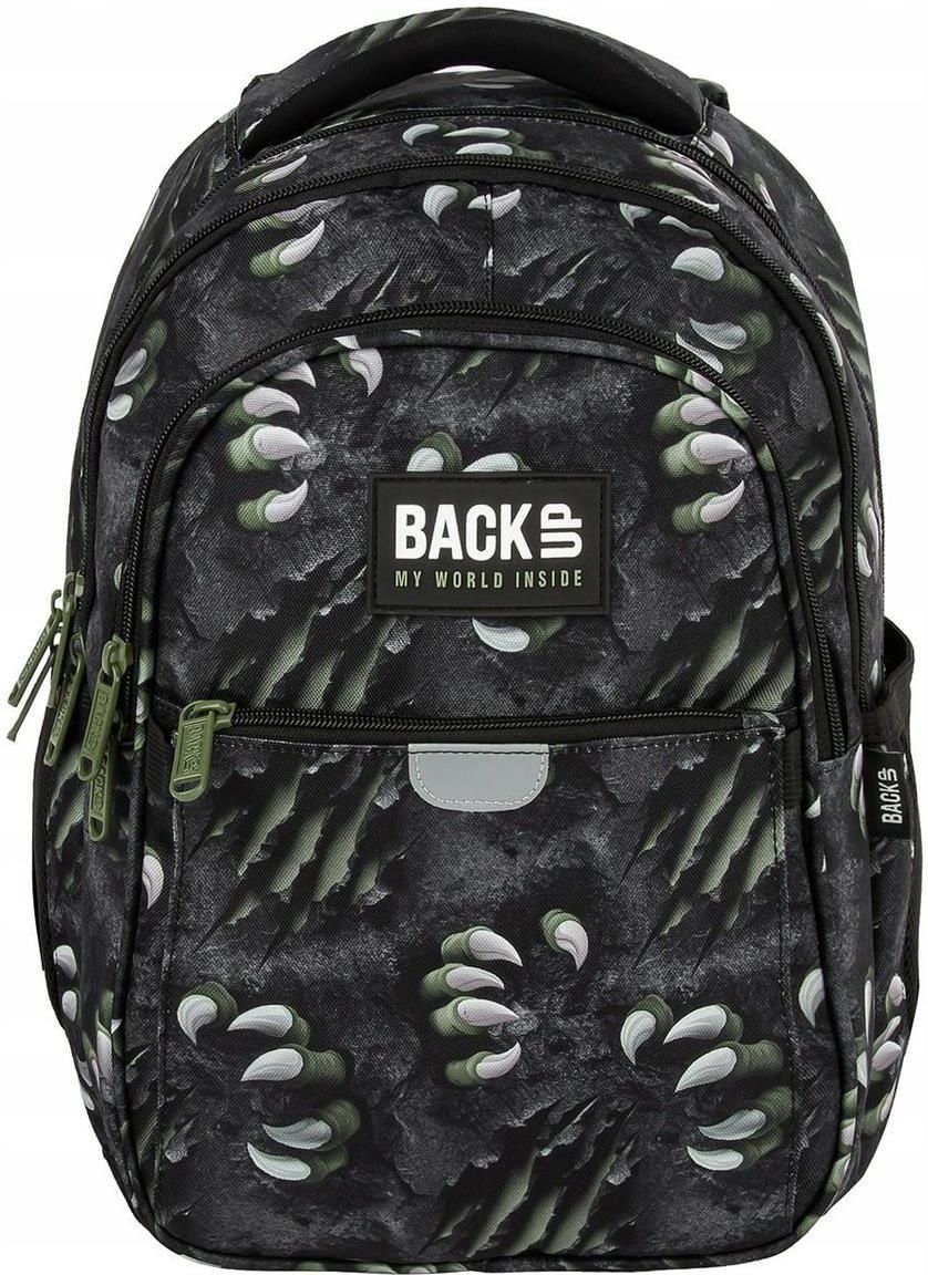 Plecak szkolny BackUP Rex dla chłopca Dinozaur pazury P62 Ten model to hołd dla młodych zdobywców miejskiej dżungli – dla dzieci, które chcą się wyróżniać i pokazać swój nieokiełznany charakter. Wyrazisty wzór inspirowany rozszarpanymi śladami pazurów oraz kontrastowe kolory – głęboka czerń …