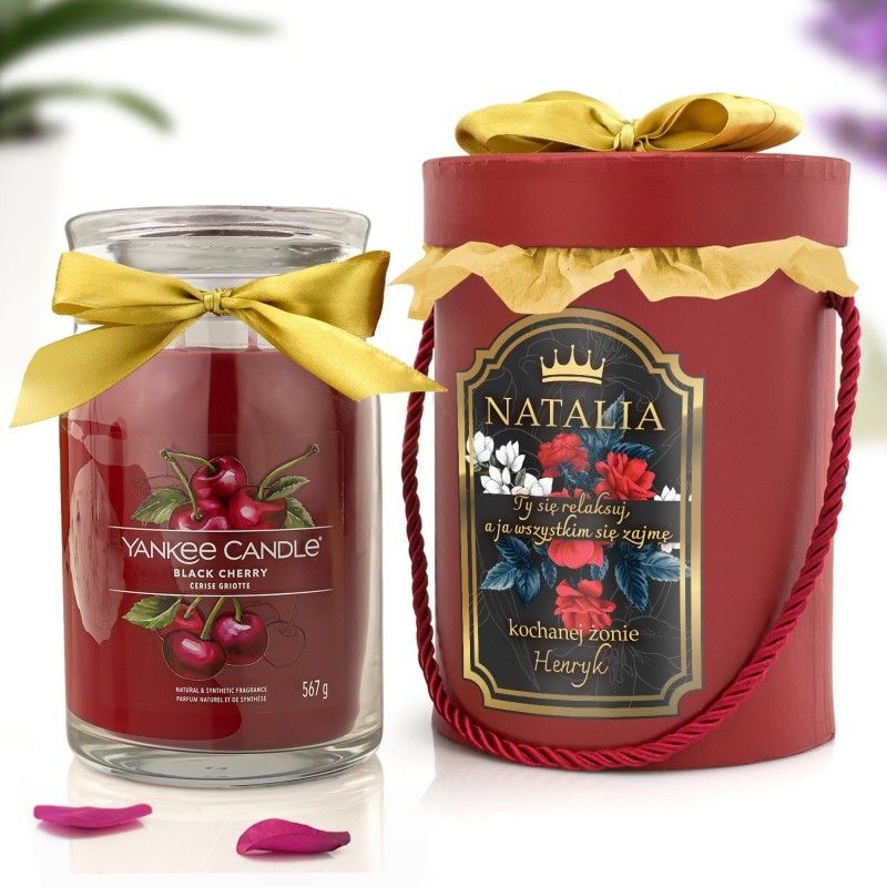 Parametry Świeca zapach: Black cherry nuty zapachowe: wiśnia, migdał, cynamon najwyższej jakości naturalny wosk czas palenia: do 90 godzin wysokość: 16 cm średnica: 9 cm dwa bawełniane knoty dla efektywnego wypalania wosku waga świecy: 567 g (bez słoja) wykaz alergenów znajdziesz tutaj: zobacz oryginalna świeca Yankee Candle Pudełko wysokość: 18 cm średnica: 13,5 cm kolor: burgund wykonane z wytrzymałej tektury najwyższej jakości personalizacja uczyni prezent jeszcze bardziej wyjątkowym Personalizacja Aby w pełni spersonalizować produkt, prosimy o przesłanie potrzebnych danych na adres email, a nasi graficy zajmą się resztą :)