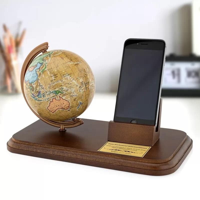 Globus i drewniany stojak na telefon z grawerem dla szefa - Gratulacje Połaniec