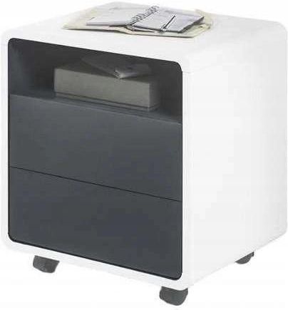Kontener na kółkach pasuje do biurka model Tadeo Kontener na kółkach z 2 szufladami, 1 otwarta półka oraz 4 kółka z funkcją przechowania Pojemnik z płyty MDF w kolorze białym matowym, zewnętrzne strony w kolorze antracytowym, szuflady z funkcją Touch to open Obciążalność kontenera na kółkach wynosi 30 kg Wymiary stelaża: szer. x wys. x gł. 47 x 55 x 38 cm Dostawa w stanie rozłożonym, łatwy montaż dzięki dobrze przemyślanej instrukcji montażu