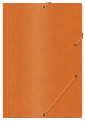 wykonana z kartonu typu preszpan o gramaturze 390gsm, powlekanego woskiem 3-skrzydłowa zamykana za pomocą 2 płaskich, narożnych gumek w kolorze teczki format: A4 rozmiar: 233x318mm kolor pomarańczowy