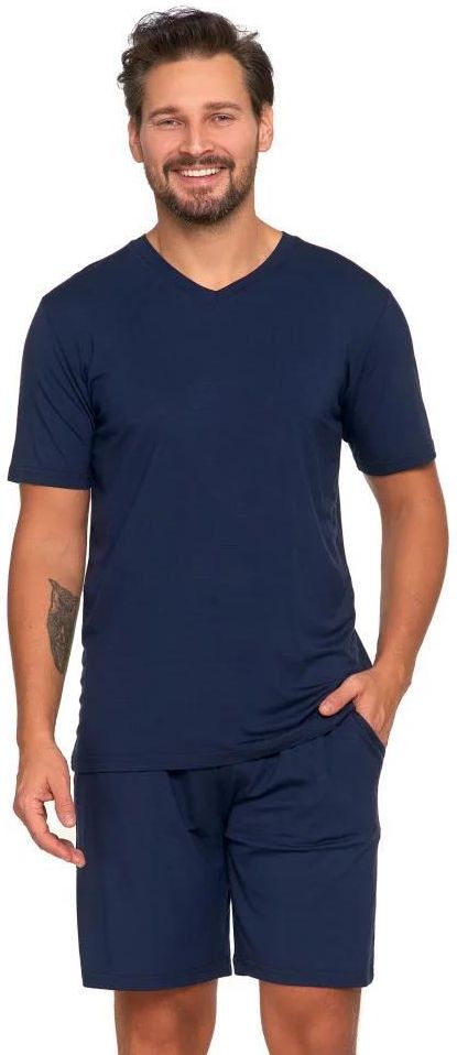 Piżama męska Moraj wykonana z wiskozy bambusowej. Góra piżamy jednokolorowa gładka w kolorze granatowym, dekolt w V. Spodenki krótkie z kieszeniami, w pasie elastyczna gumka. Piżama wykonana z przewiewnej i miękkiej wiskozy bambusowej, która zapewni komfort i wygodę. Skład: 90% wiskoza bambusowa 10% elastan