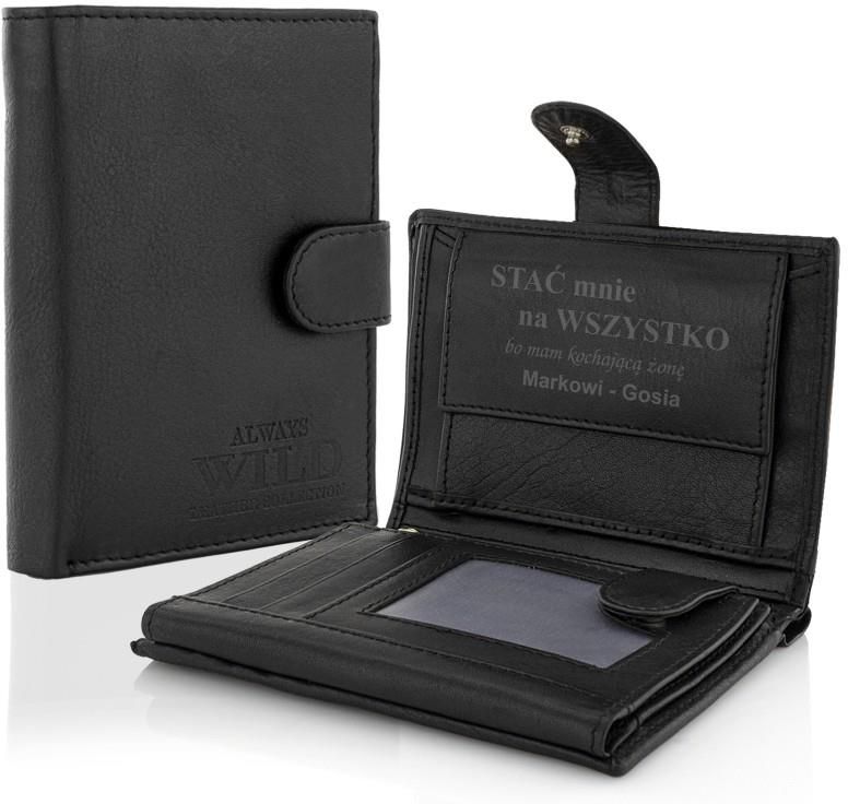 Portfel męski z grawerem to idealny prezent dla męża, jest trwały i wytrzymały na codzienne użytkowanie. To, co czyni ten portfel tak wyjątkowym, to jego personalizacja. Możesz zamówić grawer z imieniem Twojego męża, co dodaje mu jeszcze większej wartości. Z pewnością zaspokoi gust i oczekiwania mężczyzny, który ma wysokie standardy i ceni sobie luksusowe przedmioty. Parametry marka: Always Wild portfel posiada ochronę kart kredytowych: RFID Secure dwie przegrody na banknoty o długości 19 cm schowek na monety zapinany na zatrzask 12 zakładek (w tym 2 permanentne) na dokumenty, karty kredytowe, wizytówki schowek wewnętrzny na zamek wysokość: 13 cm szerokość: 10 cm szerokość po rozłożeniu: 29 cm kolor: czarny portfel może wydzielać zapach charakterystyczny dla obróbki cieplnej podczas grawerowania laserowego, który zniknie po kilku dniach Personalizacja Aby w pełni spersonalizować produkt, prosimy o przesłanie potrzebnych danych na adres email, a nasi graficy zajmą się resztą :)