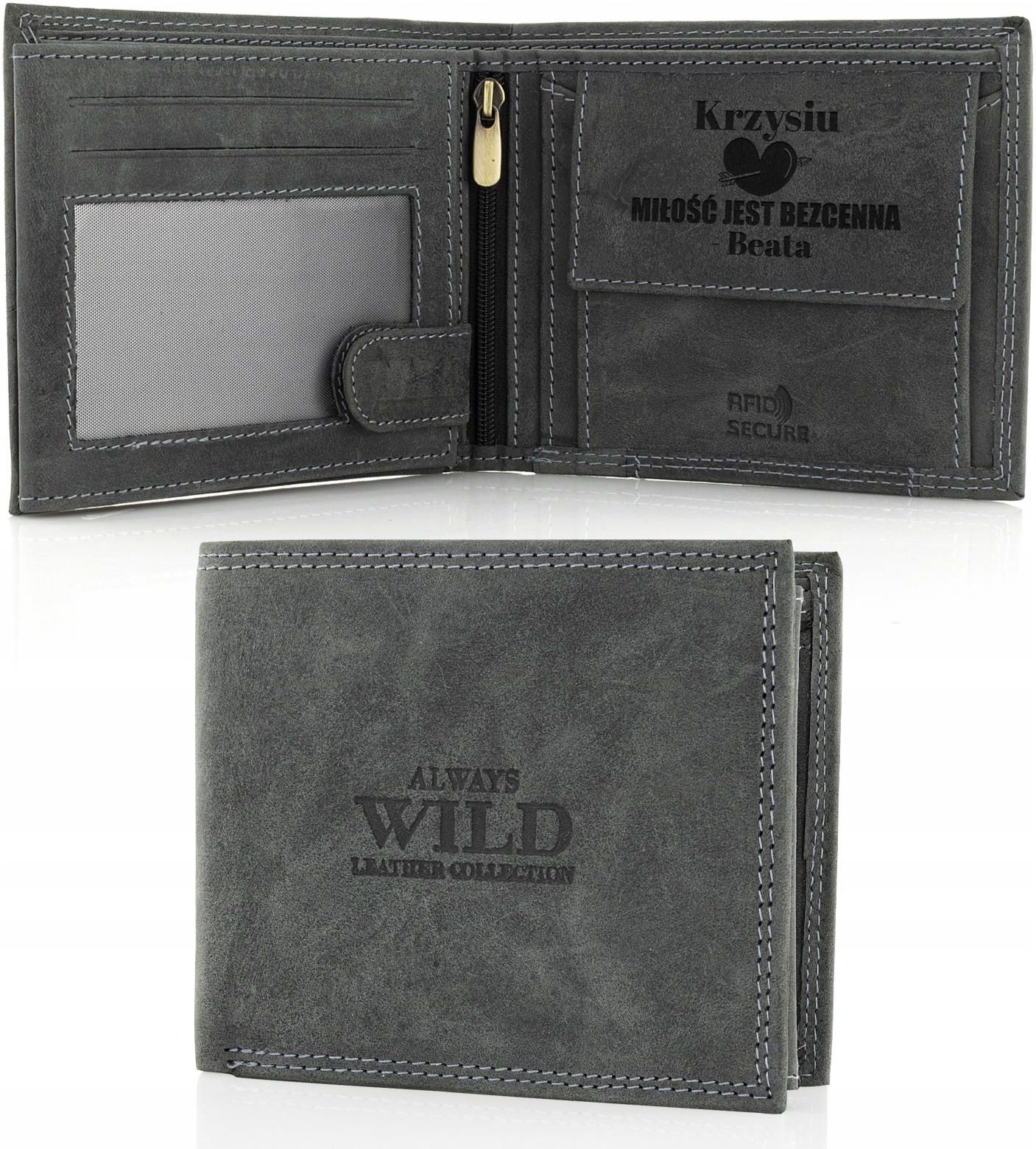 Portfel męski ze skóry naturalnej Always Wild Męski portfel wykonany z wysokiej jakości skóry naturalnej to doskonały pomysł na prezent dla każdego mężczyzny. Idealnie nadaje się na prezent z okazji walentynek, urodzin, imienin czy z okazji Dnia Chłopaka. Skóra z której został wykonany stylizowana jest na postarzałą, co nadaje mu niepowtarzalny wygląd i charakter. Wewnątrz portfela możemy wykonać grawer, dzięki któremu obdarowany nim mężczyzna poczuje się naprawdę wyjątkowo. Parametry Materiał: skóra naturalna Wymiary zewnętrze po złożeniu: 12 cm x 10,3 cm x 2,5 cm 6 przegród na karty Schowek 8 x 9cm 2 schowki z siatką na zdjęcie 2 kieszenie na banknoty 9 x 23 cm Kieszeń na monety na zatrzask Wnętrze spinane patką na zatrzask Kolor: grafitowy Portfel może wydzielać zapach charakterystyczny dla obróbki cieplnej podczas grawerowania laserowego, który zniknie po kilku dniach Nr wzoru 14379 Grawer wykonujemy techniką laserową, bezpośrednio na portfelu (wewnątrz). Dzięki wykorzystaniu nowoczesnych maszyn, grawer jest niezwykle dokładny i trwały. Maksymalna ilość tekstu jaką możemy zamieścić wewnątrz portfela wynosi 80 znaków. Spraw by Twój prezent na zawsze pozostał w pamięci obdarowanej osoby. Dołącz do niego indywidualny GRAWER. Dane do personalizacji podaj w uwagach do zamówienia.