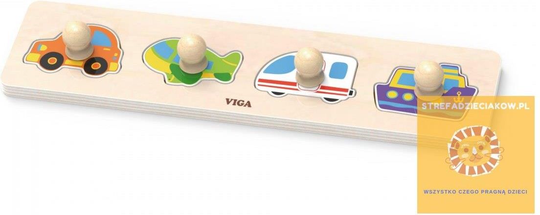 Drewniane Puzzle z Pinezkami Transport - VIGA Drewniane Puzzle z pinezkami marki Viga to idealne rozwiązanie zarówno do użytku w domu, jak i w przedszkolu. Zabawa polega na dopasowaniu czterech kolorowych elementów, przedstawiających różne środki transportu, do odpowiadających im kształtów na drewnianej podstawce. Całość wykonana jest z drewna i pomalowana bezpiecznymi farbami w żywych kolorach. Bezpieczne i trwałe wykonanie Puzzle wykonane są z najwyższej jakości drewna, co gwarantuje ich trwałość i odporność na codzienne użytkowanie. Brak ostrych krawędzi i malowanie nietoksycznymi farbami zapewniają, że produkt jest w pełni bezpieczny dla dziecka oraz przyjazny dla środowiska. Wymiary i materiał Wymiary zestawu to 30 x 7,5 x 3,5 cm, a materiał, z którego został wykonany, to solidnie pomalowane drewno. Zabawka przeznaczona jest dla dzieci od 1 roku życia. Rozwój umiejętności dziecka Zabawa drewnianymi puzzlami z pinezkami wspiera rozwój: wyobraźni, rozpoznawania kształtów, koordynacji ręka-oko, zdolności manualnych, zdolności poznawczych, umiejętności logicznego myślenia. Zalety produktu Bezpieczne farby dla dzieci Trwała konstrukcja z drewna Łatwe do chwytania pinezki Kolorowe elementy przyciągające uwagę Nie posiada ostrych krawędzi Pomaga w nauce rozpoznawania kolorów i kształtów Inspiracja do zabawy Drewniane Puzzle z pinezkami Transport to nie tylko świetna zabawa, ale także doskonała okazja, aby nauczyć dzieci o różnych środkach transportu. Dzięki kolorowym obrazkom aut, łodzi, samolotów i pociągów, dzieci mogą poznać wygląd różnych pojazdów i dowiedzieć się, którymi można podróżować. Dopasowanie odpowiednich kształtów do wypustek na planszy staje się łatwiejsze dzięki różnorodnej kolorystyce i pinezkom ułatwiającym chwytanie elementów. Zgodność z normami bezpieczeństwa Produkt spełnia normy bezpieczeństwa EN71 oraz ASTM, co potwierdza jego jakość i bezpieczeństwo użytkowania. Firma Viga, działająca na rynku od 2003 roku, zdobyła uznanie na całym świecie dzięki innowacyjnym pomysłom i produkcji ekologicznych, bezpiecznych zabawek. Drewniane Puzzle z pinezkami Transport marki Viga to wspaniały prezent dla najmłodszych, który wspomaga rozwój wielu umiejętności i zainteresowań dzieci. Do sprawdzenia #$%^