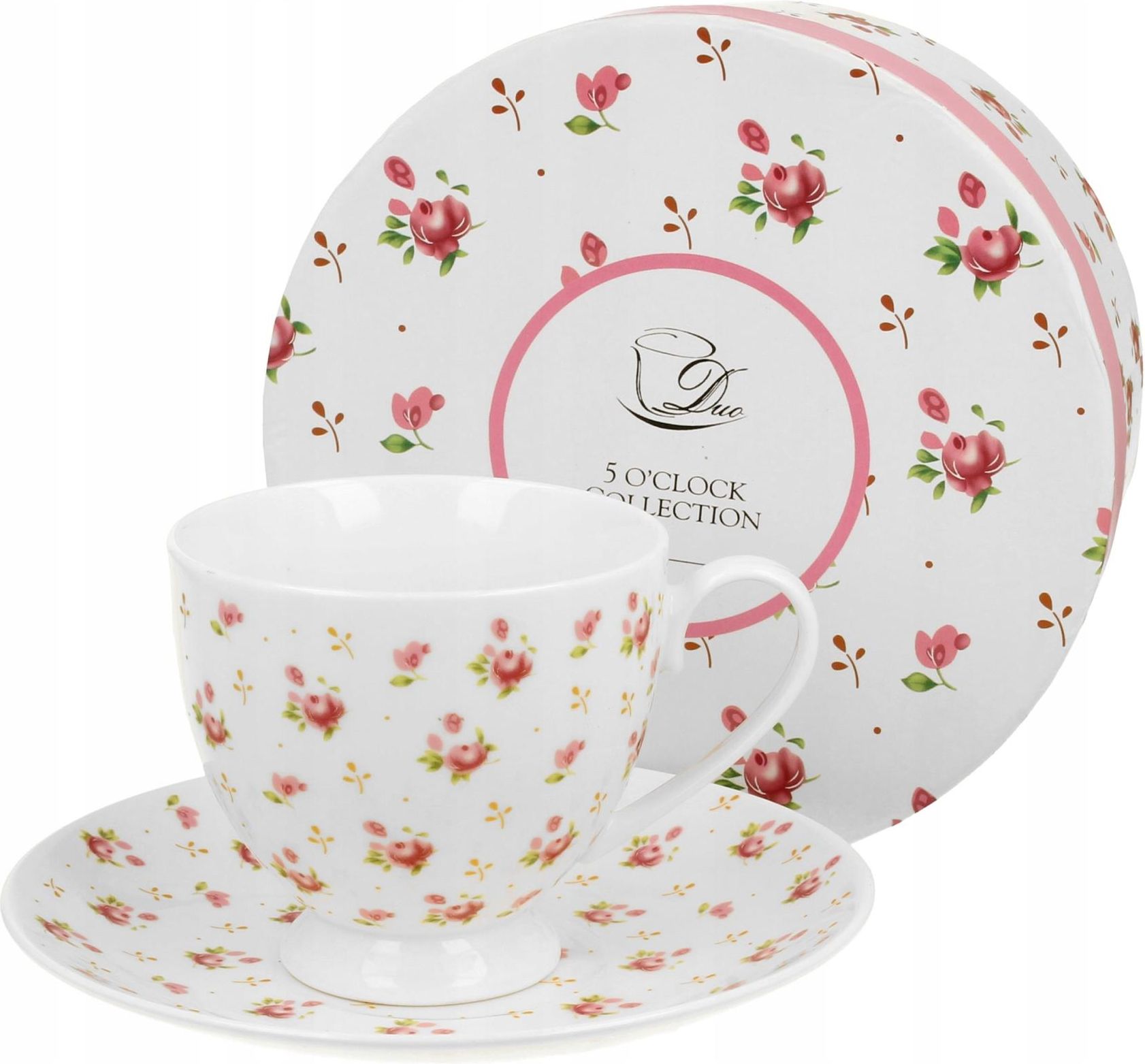 Filiżanka na stopce ze spodkiem ELENI wchodząca w skład serii Duo Classics, wykonana z porcelany New Bone China, która charakteryzuje się naturalnym kremowo-białym kolorem z delikatnym połyskiem oraz wyjątkową wytrzymałością i trwałością, zachowując lekkość i finezję. Linia zdobiona delikatnymi malutkimi gałązkami różyczek i drobnymi listeczkami, utrzymana w pastelowych kolorach, takich jak delikatne odcienie różu i zieleni. Dzięki nim emanuje delikatnością i przyjemnym, kojącym uczuciem. Zdobienia dodają filiżance unikalnego charakteru i sprawiają, że jest ona niepowtarzalna. Całość zapakowana w ozdobne pudełko dekorowane tym samym motywem to idealny pomysł na niebanalny prezent. Z pewnością sprawi radość i będzie przypominać o wyjątkowych chwilach spędzonych przy filiżance gorącego napoju. Nasza filiżanka to nie tylko praktyczny przedmiot codziennego użytku, ale również małe dzieło sztuki, które wspaniale uzupełni każdy wnętrzarski styl i wprowadzi do niego subtelny akcent. Dane produktu Materiał porcelana New Bone China Pojemność maksymalna 220 ml Średnica 8,5 cm Wysokość 7,7 cm Szerokość z uchem 11,5 cm Średnica spodka 15,4 cm Waga netto 0,36 kg Waga brutto 0,49 kg Zastosowanie Zmywarka Tak Mikrofalówka Tak Giftbox Szerokość pudełka 16,6 cm Długość pudełka 16,6 cm Wysokość pudełka 9 cm Rodzaj opakowania gift box