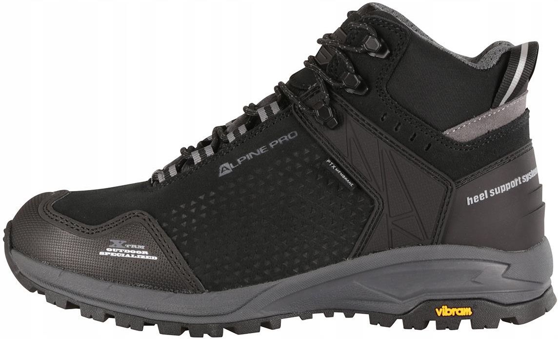 ALPINE PRO Buty trekkingowe za kostkę skórzane Erahe czarny r.40 8591747533880 Buty trekkingowe za kostkę skórzane Alpine Pro Erahe Skórzane buty trekkingowe Alpine Pro Erahe to wszechstronne obuwie idealne na wyprawy w niskie i średnie partie gór. Dzięki zaawansowanej podeszwie Vibram® XS-Trek, te buty zapewniają doskonałą przyczepność do podłoża oraz skuteczną amortyzację, co sprawia, że każdy krok staje się pewniejszy i bardziej komfortowy. Podwyższona cholewka w stylu MID została wykonana z jednego płata wysokiej jakości skóry nubukowej, co zwiększa trwałość butów i gwarantuje ich długą żywotność. Dzięki dodatkowej fabrycznej impregnacji DWR, skóra nubukowa nie chłonie wilgoci, co jest kluczowe w zmiennych warunkach pogodowych. Wodoodporna i oddychająca membrana PTX skutecznie chroni przed przemoczeniem, jednocześnie dbając o odpowiednią wentylację stóp. Zastosowanie tego rodzaju membrany zapewnia, że nawet podczas dłuższych wędrówek stopy pozostają suche i świeże. Wewnątrz tych trekkingowych butów w góry znajdziesz antybakteryjną wkładkę PEP, która nie tylko zapobiega namnażaniu się bakterii, ale również eliminuje nieprzyjemne zapachy. Dodatkowe elementy, takie jak gumowe wzmocnienie nosów i dedykowane wzmocnienie pięty HSS, chronią buty przed uszkodzeniami, a miękki zapiętek oraz system odblasków Streak Reflex zwiększają komfort noszenia i bezpieczeństwo po zmroku. Zalety Antypoślizgowa i amortyzująca podeszwa Vibram® XS-Trek poprawiająca przyczepność do podłoża Typ cholewki : podwyższana, MID Dodatkowa, fabryczna impregnacja buta DWR Materiał wierzchni: skóra nubukowa Cholewka uszyta z jednego płata skóry Wodoodporna i oddychająca membrana PTX Antybakteryjna wkładka PEP zapobiegająca powstawaniu nieprzyjemnych zapachów Gumowe wzmocnienie nosów, zapobiegające uszkodzeniu buta Dedykowane wzmocnienie pięty HSS® Miękki zapiętek zapobiegający otarciom ścięgna Achillesa System odblasków Streak Reflex zwiększający widoczność po zmroku UBTD39599040