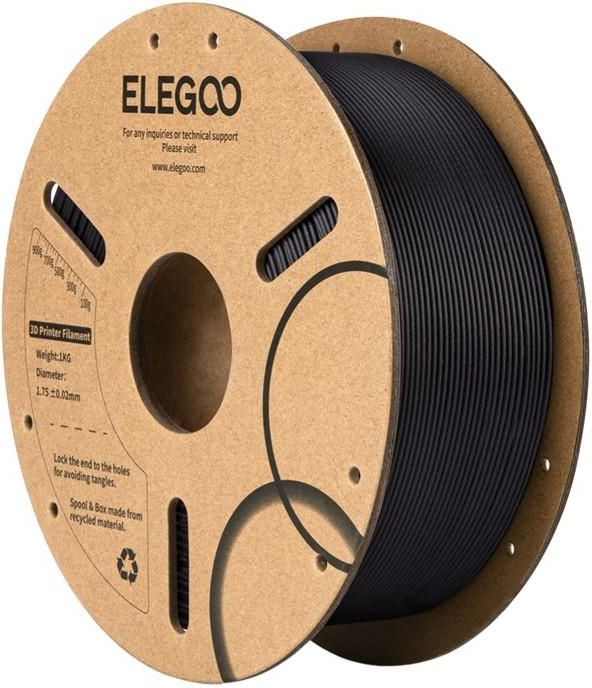Filament PLA-CF ELEGOO (czarny) Filament ELEGOO PLA-CF (polilaktyd z domieszką włókna węglowego) łączy łatwość druku typową dla PLA (polilaktydu – tworzywa roślinnego pochodzenia, biodegradowalnego) z większą wytrzymałością mechaniczną. Dodatek włókna węglowego zwiększa sztywność materiału i ogranicza jego skurcz podczas chłodzenia, co przekłada się na większą precyzję wymiarową. Tego typu materiał dobrze sprawdza się w elementach technicznych, obudowach i prototypach, które muszą być trwałe, ale lekkie.