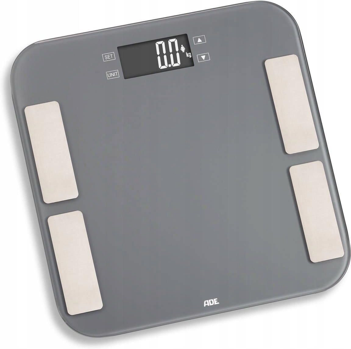 WAGA ŁAZIENKOWA elektroniczna z POMIAR TKANKI ADE Specyfikacja techniczna Id produktu: 93414 Kolor: szary Długość: 33,0 cm Szerokość całkowita: 33,0 cm Wysokość całkowita: 2,0 cm Symbol producenta: ad-ba 1807 Zasilanie: 1 x bateria cr2032 (dołączono) Dokładność: 100 g Max. obciążenie: 180 kg Materiał: szkło -------------------------------------------- Rozmiar ekranu LCD::Długość: 8,0 cm ; Szerokość całkowita: 3,9 cm -------------------------------------------- Istotne informacje Jednostki: kg, lb, st Możliwość wprowadzenia informacji o użytkownikach – do 10 osób Obliczanie wskaźnika masy ciała Za pomocą analizy impedancji bioelektrycznej waga wskazuje zawartość: - tkanki tłuszczowej - tkanki mięśniowej - tkanki kostnej - wody