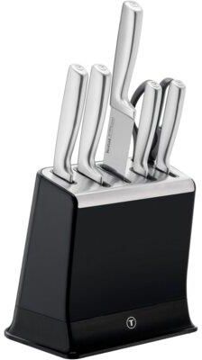 Tefal Ever Sharp K2977S44 6 elementów Zestaw noży TEFAL EverSharp: Samo ostrzące się noże zapewniają długotrwałą ostrość TEFAL Ever Sharp to nóże, które pozostają ostre każdego dnia dzięki automatycznemu ostrzeniu wbudowanemu w blok. Wysokiej jakości niemiecka stal nierdzewna zapewnia trwałość i precyzję krojenia, a ergonomiczna, bezpieczna konstrukcja gwarantuje pełen komfort pracy. Idealny do codziennego użytku, zawsze gotowy do perfekcyjnego cięcia. Noże, które pozostają zawsze ostre Ciesz się doskonałą wydajnością krojenia dzień po dniu i rok po roku - dzięki nożom, które są automatycznie ostrzone przed każdym użyciem. Optymalny system ostrzenia Ukryty wewnątrz bloku, opatentowany system ostrzenia prowadzi ostrza i w pełni je ostrzy przy wywarciu odpowiedniego nacisku. Ostrzenie bez wysiłku Po użyciu schowaj nóż, aby znów był ostry! Nawet nie musisz myśleć o ostrzeniu za sprawą łatwego sposobu obsługi. Ostre dla optymalnej jakości krojenia Ciesz się doskonałym krojeniem za każdym razem, od carpaccio z ananasa z nożem szefa kuchni po delikatne sashimi z łososia z nożem santoku. Niemiecka stal nierdzewna Wysokiej jakości ostrza z niemieckiej stali nierdzewnej zapewniają doskonałą trwałość, odporność na rdzę i długotrwałą ostrość. Pełna kontrola Dzięki wyważonej konstrukcji, bezpiecznej osłonie palców i ergonomicznej rękojeści krojenie nigdy nie było tak przyjemne.