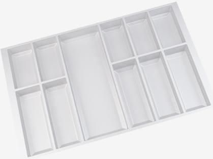 Peka 07.60162.BL - Wkład CLASSICO 800 do szuflady Antaro o wymiarch 716 x 5901554243965 Wkład CLASSICO 800 do szuflady Antaro o wymiarch 716 x 474/ biały wkład na sztućce Wkład Classico na sztućce i akcesoria kuchenne w kolorze białym. Wkład pasuje do szuflad o szerokości frontu 800 mm i głębokości prowadnicy 500 mm. Wkład ma po szerokości i po długości szerszy zapas, który umożliwia samodzielne docięcie wkładu do niestandardowych wymiarów szafki z szufladami. Wkład do szuflady wykonany jest z bardzo dobrego jakościowo, wytrzymałego tworzywa sztucznego, bezzapachowego, o grubości 2 mm. Solidny, odporny na odkształcenia i pęknięcia, jest bardzo lekki. Jest łatwy do czyszczenia, gładka powierzchnia wkładu nie „przyjmuje brudu”, nie widać na niej smug czy zarysowań. Jest bardzo estetycznie wykonany i bardzo ładnie wygląda w każdej szufladzie nie tylko w nowoczesnych meblach ale również w szufladach bardziej tradycyjnych. Praktyczny wkład do szuflady pozwoli na utrzymanie porządku i szybkie odłożenie umytych sztućców na właściwe miejsce. Przy podanej szerokości do dyspozycji mamy 11 komór. Pięć mniejszych komór posłuży do przechowywania łyżeczek, widelczyków czy innych drobnych akcesoriów np.: zaparzacza do herbaty, 5 większych komór świetnie zorganizuje przestrzeń na łyżki stołowe, noże i widelce. Wymiary wkładu: szerokość: 716 mm długość: 474 mm wysokość: 53 mm. Wymiary komór (komory posiadają kształt zbliżony do trapezu): 5x komory małe 170x90 mm (wymiar u góry komory), 143x63 mm (wymiar na dnie komory), 5x komory średnie 250x93 mm (wymiar u góry komory), 220x63 mm (wymiar na dnie komory), 1x komora największa 430x160 mm (wymiar u góry komory), 400x130 mm (wymiar na dnie komory), Uwaga: nie świadczymy usług w zakresie docinania wkładu. W razie potrzeby wkład można przycinać samodzielnie nożykiem tapicerskim lub na maszynie stolarskiej. Sposób docięcia wkładu: wkład układamy płaską stroną na równej i twardej powierzchni, w odpowiednim miejscu przykładamy długą linijkę i przy pomocy ostrego nożyka przerysujemy kilka razy w tym samym miejscu, następnie załamujemy odciętą krawędź. Do wkładu polecamy profile wykończeniowe, które idealnie zakryją ewentualne nierówności powstałe podczas docinania wkładu oraz wypełnią szczeliny między bokiem szuflady a wkładem (profile do dokupienia, nie wchodzą w komplet z wkładem). Parametry techniczne Wykończenie Kolor biały Wymiary Wysokość 53 mm Szerokość 716 mm Głębokość 474 mm 07.60162.BL